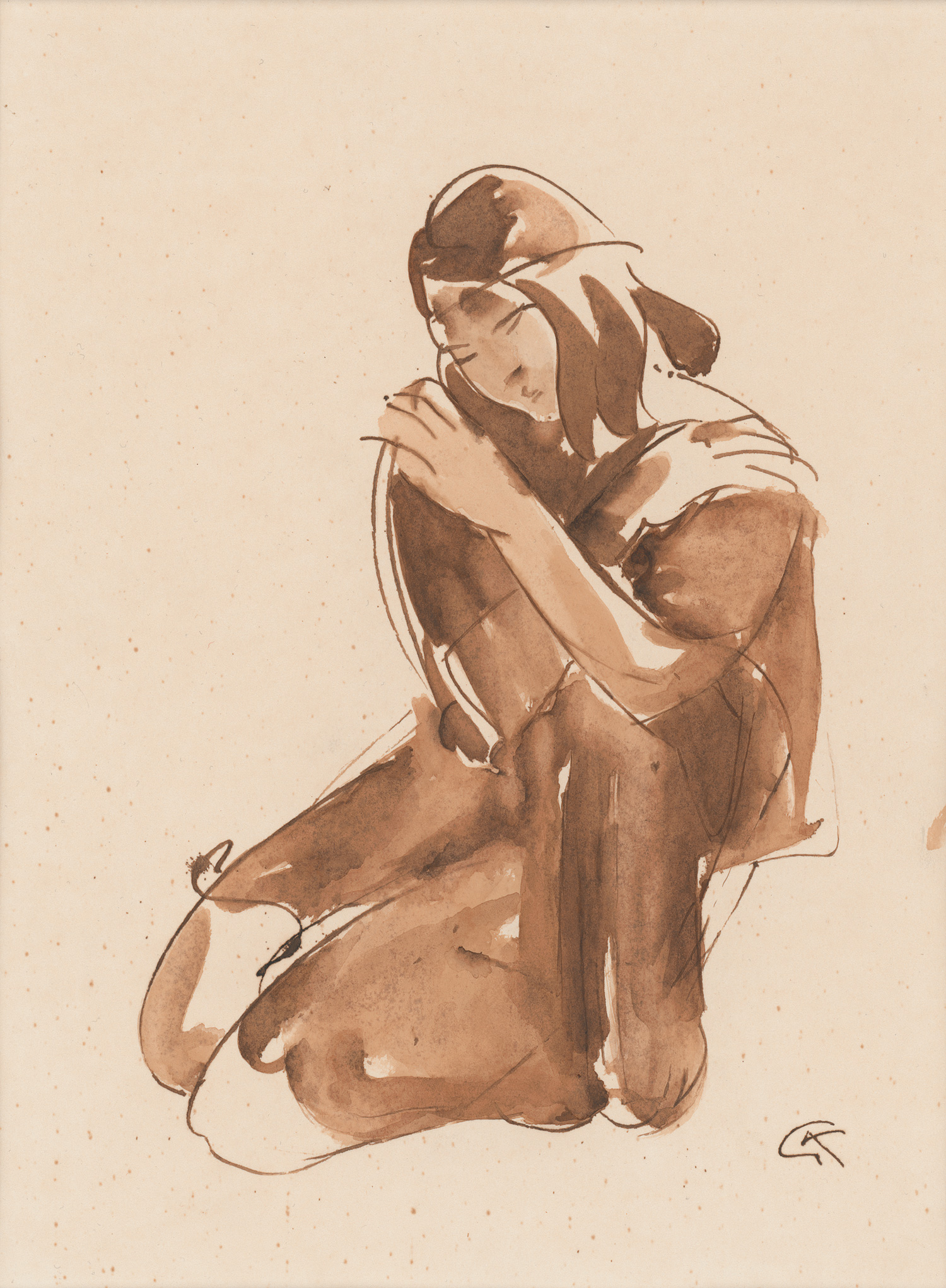 Kolbe, Georg. Sitzende. Federzeichnung in Sepiatinte auf Papier mit Lavierung in Umbratusche. Unten rechts vom Künstler monogrammiert in Feder "GK". 38 x 28 cm (Passepartoutausschnitt). Mit Karton-Passepartout unter entspiegeltem Museumsglas in vergoldeter Holzrahmenleiste. 67 x 55 cm. Um 1925.