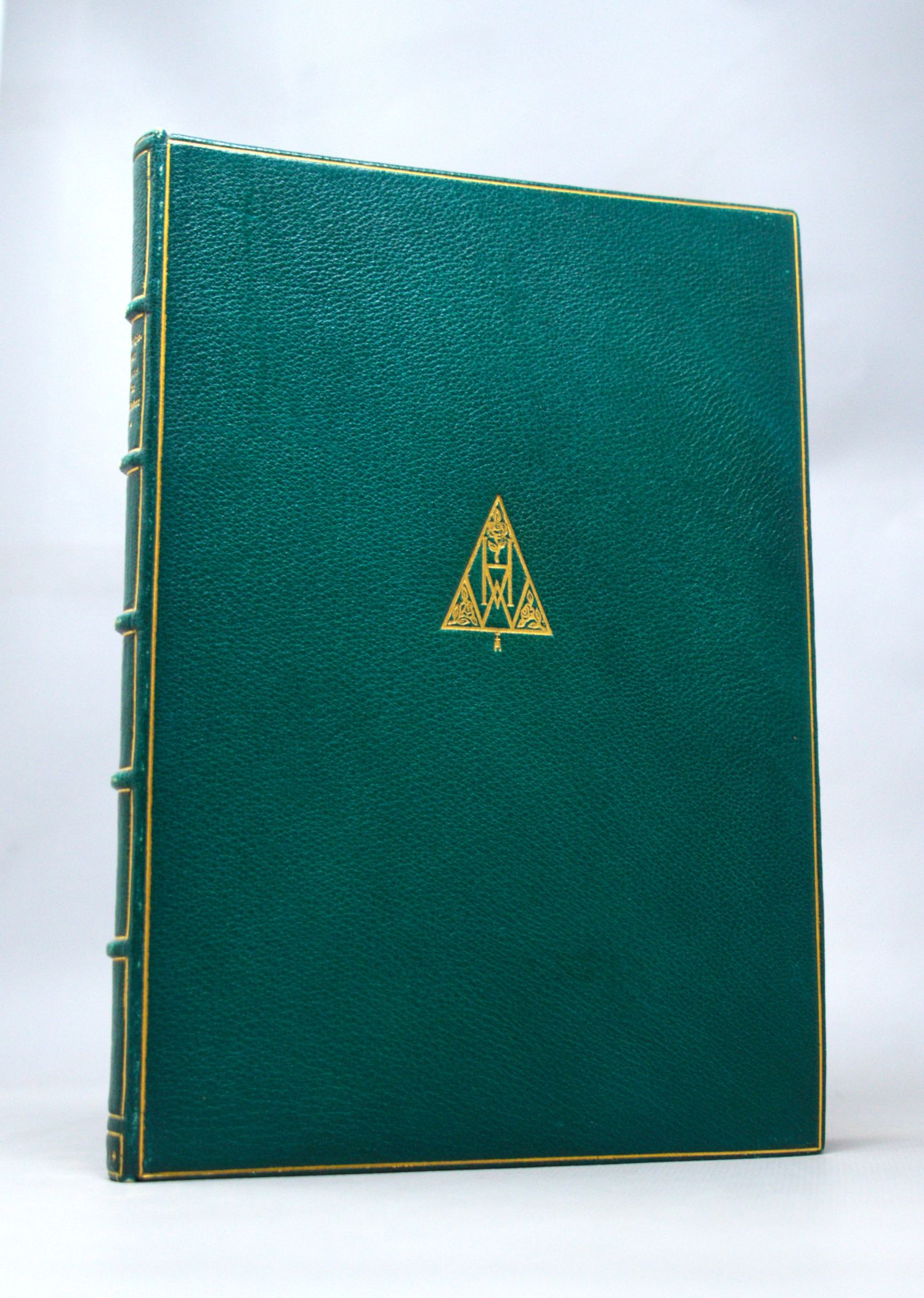 Matthießen, Wilhelm. Hans der Räuber und Margret die Zauberin. Ein Märchen. 70 S., 1 Bl. Mit zahlreichen (4 ganzseitigen) Textillustrationen von Robert Engels. 25 x 17 cm. Grüner OMaroquinband (gering berieben) mit RVergoldung, goldgeprägtem RTitel, Deckel- und Stehkantenfilete, doppelter Innenkantenfilete, goldgeprägtem Verlagssignet auf dem VDeckel sowie KGoldschnitt. München, Hans von Weber 1919.