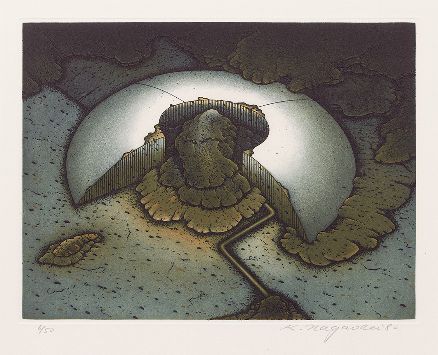 Eines von 50 num. Exemplaren (Gesamtauflage 60 Ex.). Druckvermerk vom Künstler signiert. In seinem zweiten Projekt widmet sich Nagaoka dem Asama, einem aktiven Vulkan auf der japanischen Hauptinsel Honshu. Kunito Nagaoka, 1940 in der Präfektur Nagano geboren, lebte über 20 Jahre in Berlin. Seine Technik, vor allen der Zweiplattendruck bei Radierungen, war zu dieser Zeit außergewöhnlich. Er arbeitet heute als Professor an der Kunsthochschule Kyoto-shiritsu Geijutsu Daigaku in Kyoto. Das beeindruckende Portfolio mit begleitenden Texten auf Englisch und Deutsch. Jede Radierung wurde von Michael Schlemme in Berlin von zwei verstählten Kupferplatten in zwei bis drei Farben gedruckt. Das Plattenformat von 20 x 26,5 cm wurde auf 300g Hahnemühle Kupferdruckpapier im Format 39,5 x 41,5 cm gedruckt. – Frisches Exemplar.
