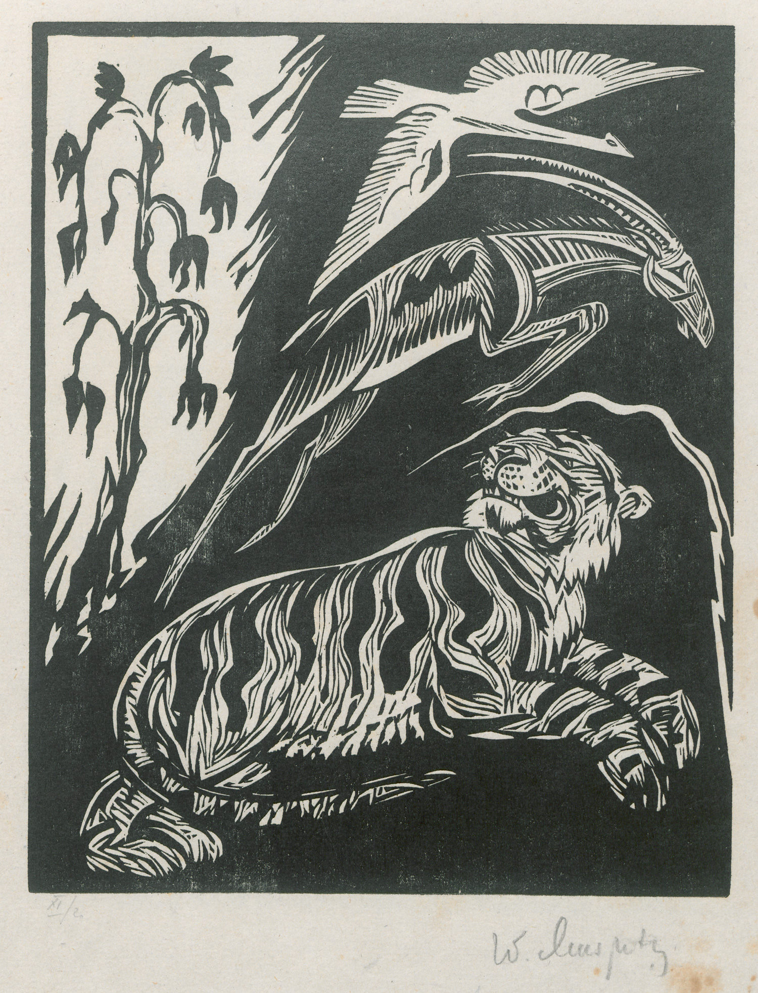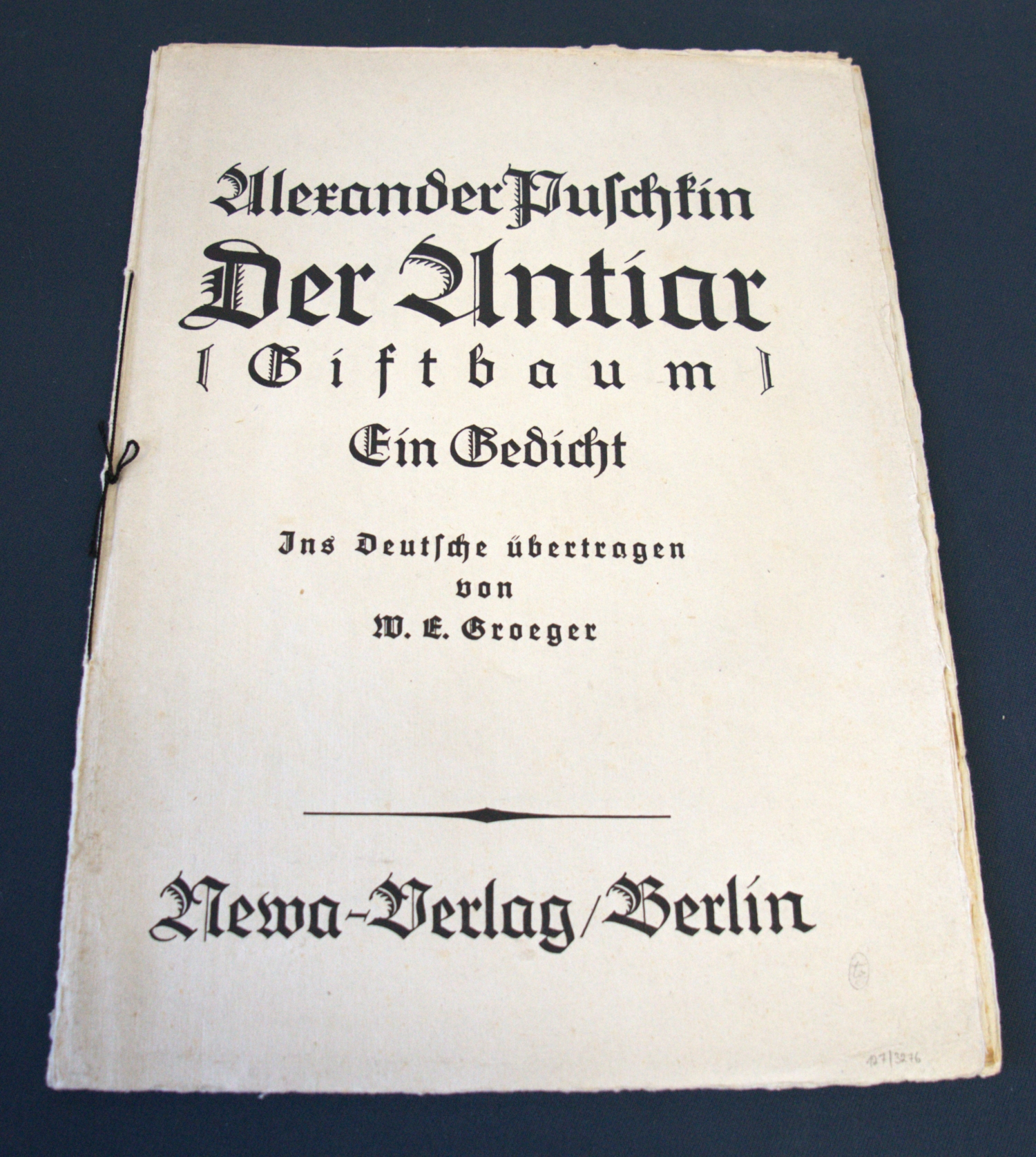 Puschkin, Alexander S. Der Antiar (Giftbaum). Mit 6 signierten Originalholzschnitten von W. Masjutin. 48 x 34,5 cm. OBroschur (berieben, fleckig und unterers Kapital mit Einriss) in Fadenbindung mit DTitel. Berlin, Newa, 1922.