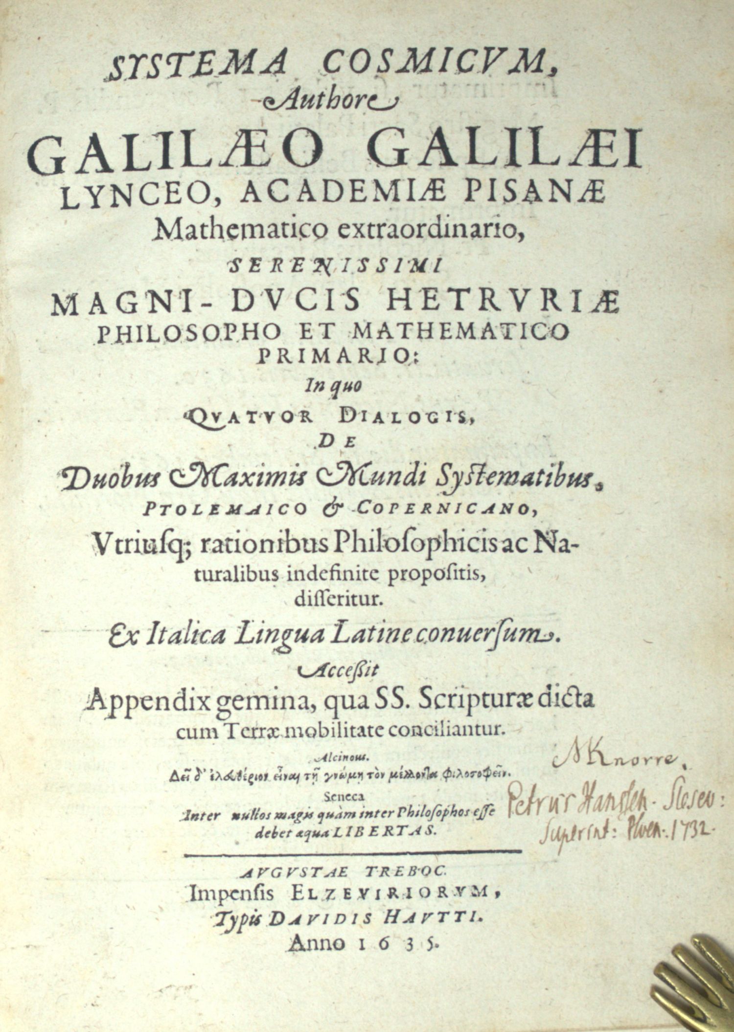 (1582-1640)Systema cosmicum. Straßburg, David Hautt für Elzevier, 1635. – Erste lateinische Ausgabe von Galileis physikalischem Hauptwerk