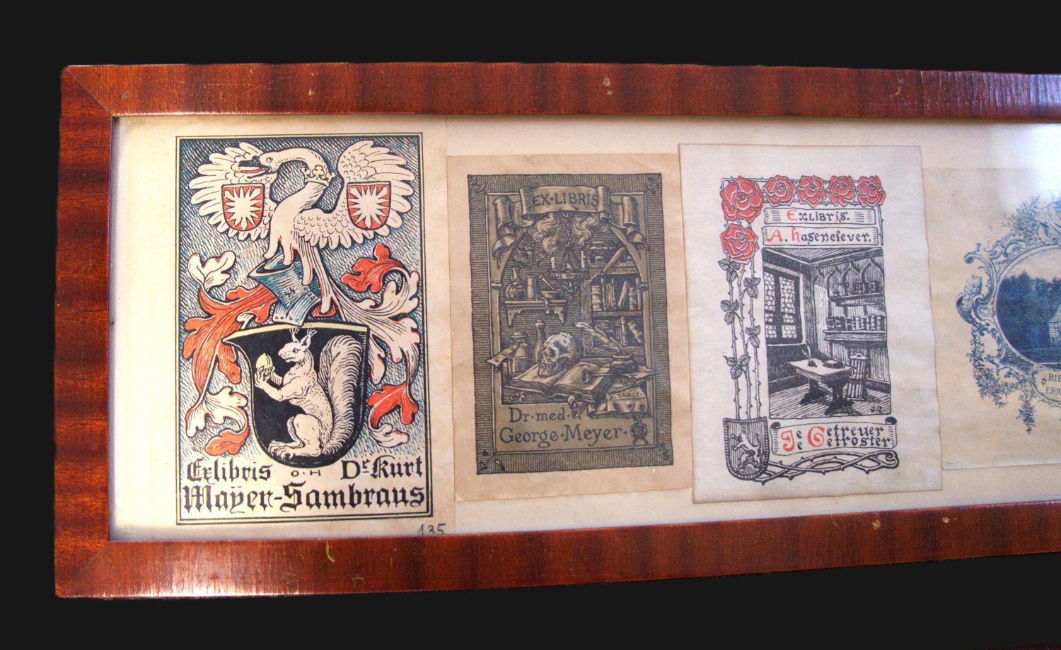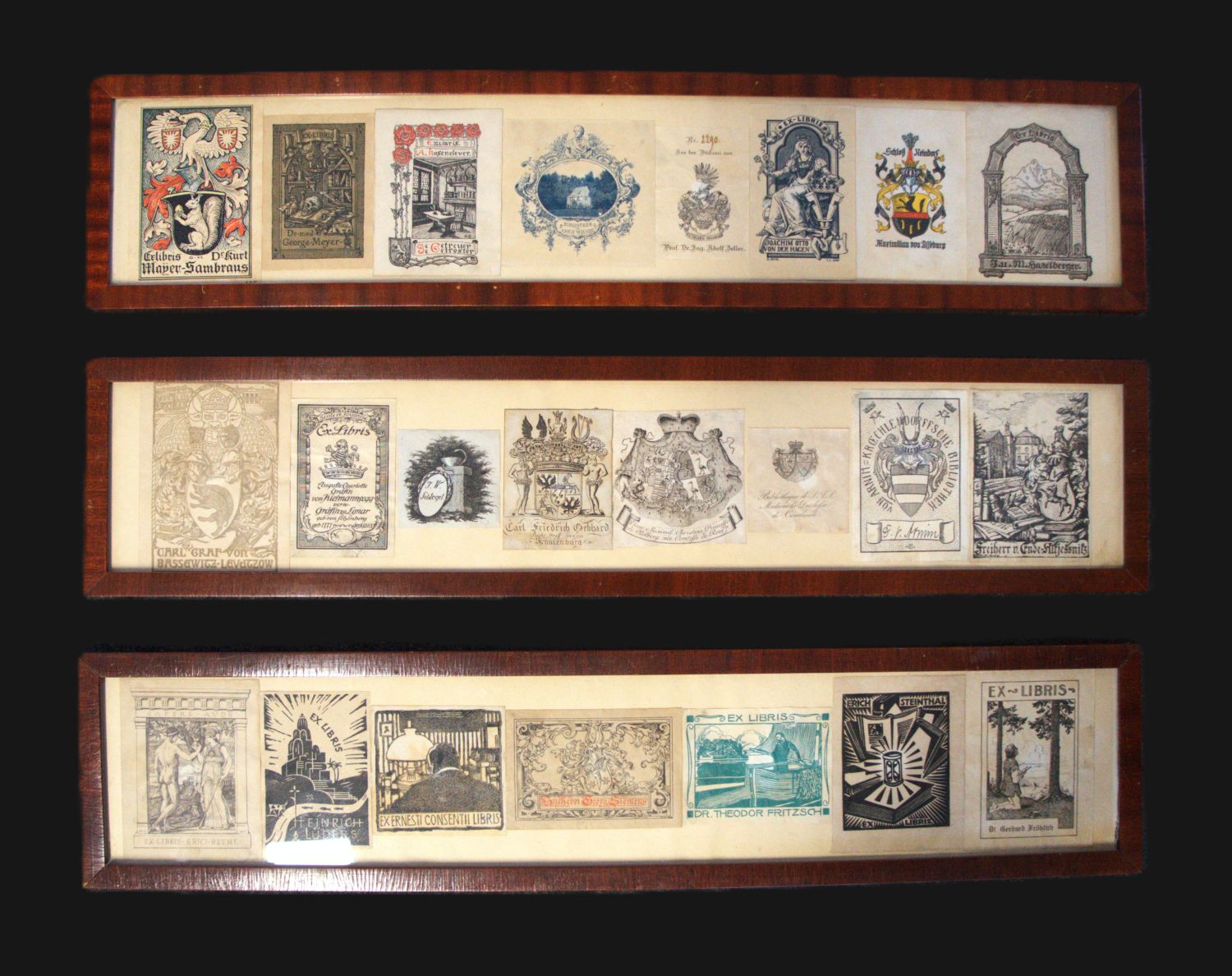 Exlibris. - Sammlung von 23 gestochenen und geschnittenen Exlibris. Unter Glas gerahmt in schlichter Holzleiste. Je 15 x 67 cm. Deuschland 19. bis frühes 20. Jahrhunderts.