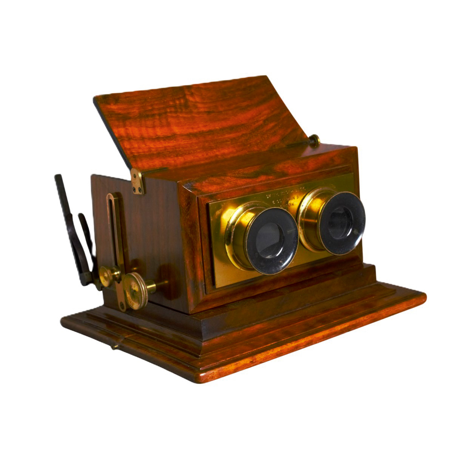 Fein gearbeitetes, kleines Tisch-Stereoskop der bekannten Londoner Optikfirma Smith, Beck & Beck, geführt von den Brüdern Richard und Joseph Beck. Der Apparat diente der genaueren Betrachtung von Stereo-Photografien u. a.; ausgestattet mit seitlichen Fokussierrädern sowie messinggefassten Okularen. – Altersgemäß sehr gut erhalten. Mahagoniholz mit leichten Gebrauchsspuren und partiellen Abriebstellen, vereinzelten Bestoßungen. Optische Gläser klar. Aufbewahrungskasten mit leichten Kratz- und Schabspuren, insgesamt gepflegter Gesamteindruck.