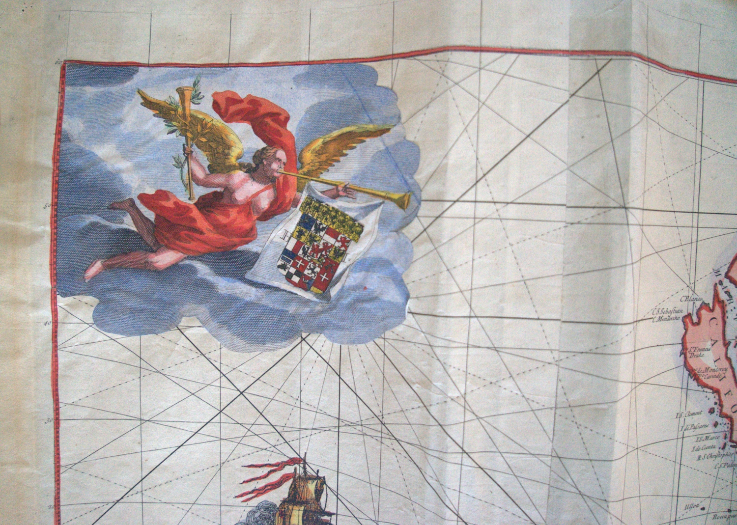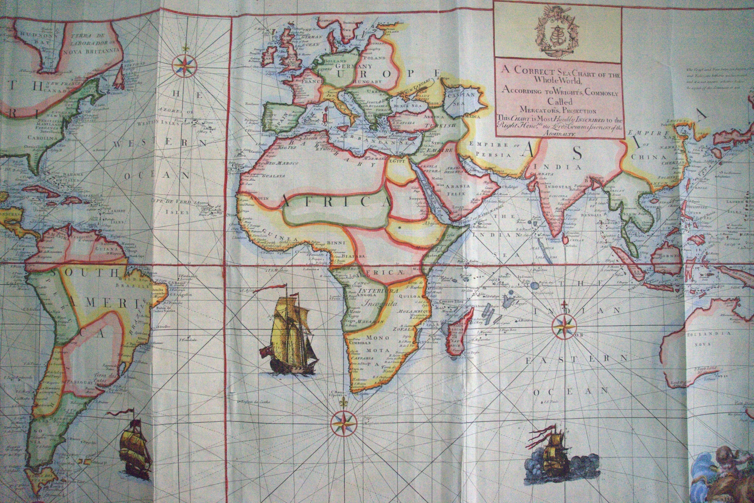 Senex, John. A correct sea chart of the whole world, according to wright's, commonly called Mercator's Projection. Kolorierte Kupferkarte von zwei Platten gedruckt und mit montierten kolorierten Kupferstichfragmenten. London, J. & J. Knapton, 1728.