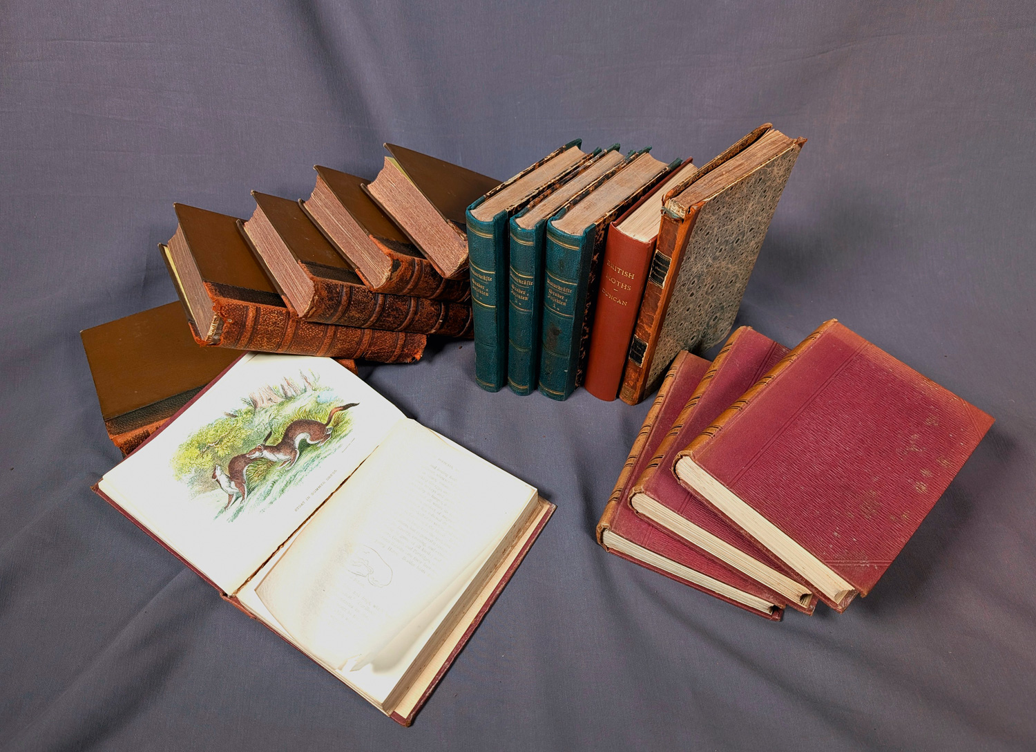 Lloyds natural history. Vorhanden sind folgende Bände der Reihe. Part I. Butterflies Vol. I.; Part I. Butterflies Vol. II.; Vol. III. Butterflies. Hesperiidae. Moths. Part I.; Vol. IV. Moths. Part II.; Vol. V. Moths. Part III. – Etwas stockfleckig, Bindung teils etwas gelockert. – Dabei: 4 Bände aus derselben Reihe: A handbook to the primates. Vol. I. und Vol. II; - A handbook to the marsupialia and monotremata. - A handbook to the british mammalia. Mit zahlreichen chromolithographischen Tafeln. Halbleinen d. Z. (Gebrauchsspuren). Ebenda 1896. - Mit Gebrauchsspuren. - Vitus Graber. Die Insekten. 3 Bände. Mit zahlreichen Holzschnittillustrationen. Halbleinen d. Z. München, R. Oldenburg, 1877-1879. - Vorhanden sind Teil I. Der Organismus der Insekten; Teil II. Vergleichende Lebens- und Entwicklungsgeschichte der Insekten (in zwei Teilbänden). - Etwas gebräunt und braunfleckig. - James Duncan. The naturalist's library. Entomology. Vol. IV. Mit zahlreichen chromolithographischen Tafeln. Moderner Leinenband. Edingburgh, W. H. Lizars, 1836. - Wohlerhalten. - Albert Dietrich. Terminologie der phanerogamischen Pflanzen; zum Unterricht in der Botanik für Lehranstalten. Zweite Auflage. Mit 24 lithographischen Tafeln. Halbleder d. Z. (oberes Kapitale eingerissen). Berlin, Enslin, 1838. - Stockfleckig.