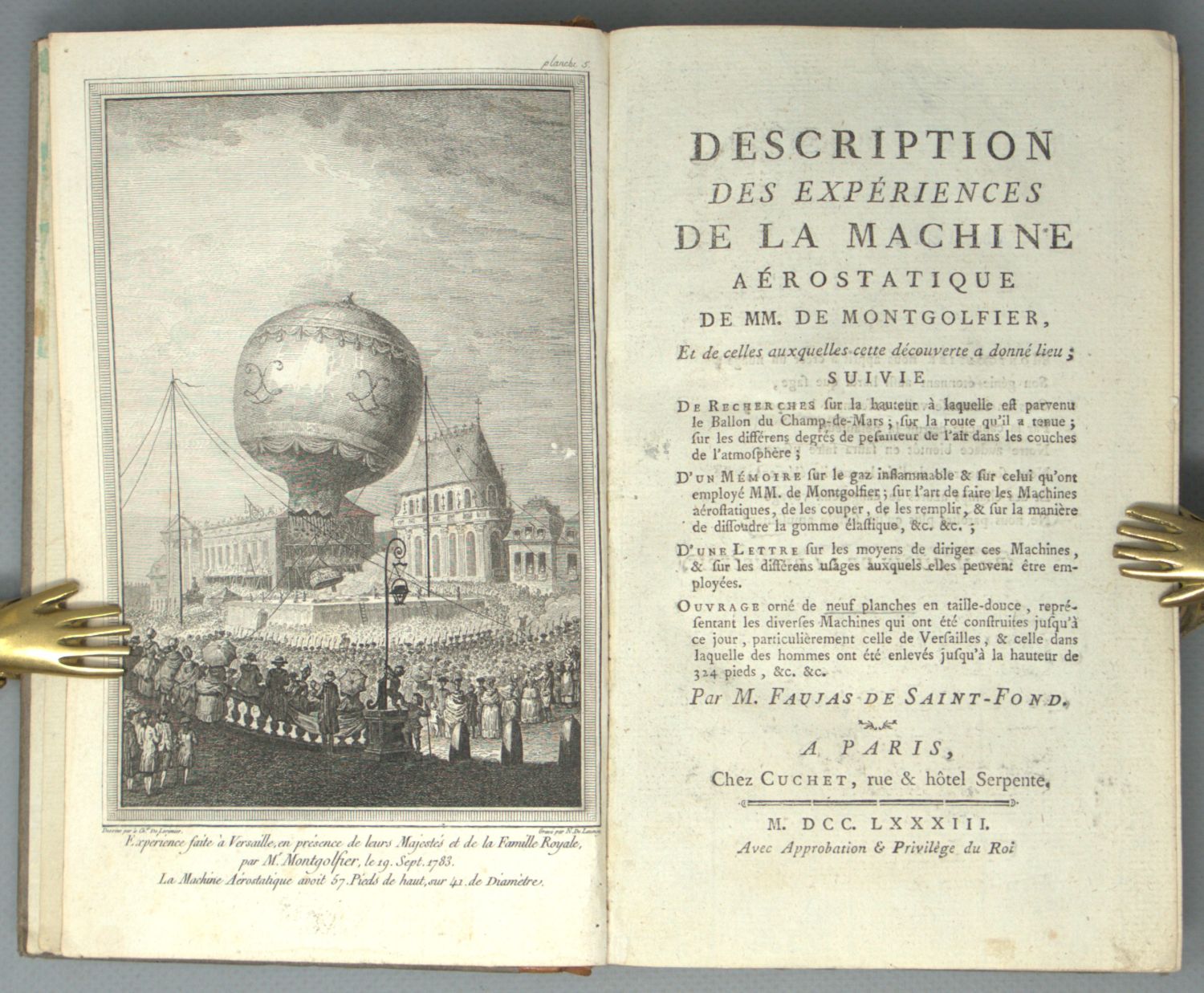 Tissandier 21. Brockett 4377. Liebmann-Wahl 978. PMM 229. – Erste Ausgabe. Der Klassiker der Aeronautik schlechthin, die "erste ernsthafte Abhandlung über die Ballonschiffahrt als praktisch durchführbare Möglichkeit" (Carter-Muir). Der erste authentische Bericht über die Arbeiten der Gebrüder Montgolfier und ihren sensationellen Ballonstart am 19. September 1783. Unser Exemplar enthält zusätzlich zwei Porträts der Gebrüder Montgolfier, eines von Pigeot und das bei Liebmann-Wahl 47 beschriebene von Delaunay nach Houdon: die erste Fassung des oft wiederholten und kopierten Doppelporträts in Medaillenform.