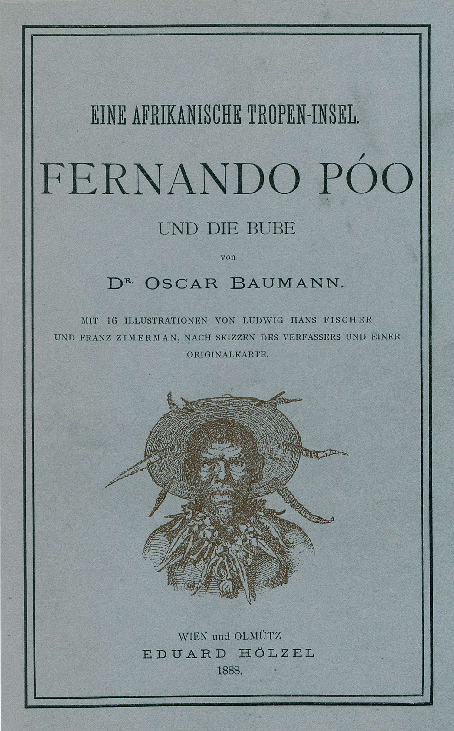 Baumann, Oscar. Eine afrikanische Tropen-Insel. Fernando Póo und die Bube. Dargestellt auf Grund einer Reise im Auftrage der K. K. Geographischen Gesellschaft in Wien. IX, 150 S. Mit doppelblattgroßer lithographischer Tafel, einigen teils ganzseitigen Textillustrationen und mehrfach gefalteter chromolithographischer Karte. 23 x 15 cm. Halbleder d. Z. (Gelenke beschabt; hellblaue OBroschur eingebunden) mit RVergoldung und goldgeprägtem RTitel. Wien und Olmütz, Eduard Hölzel, 1888.