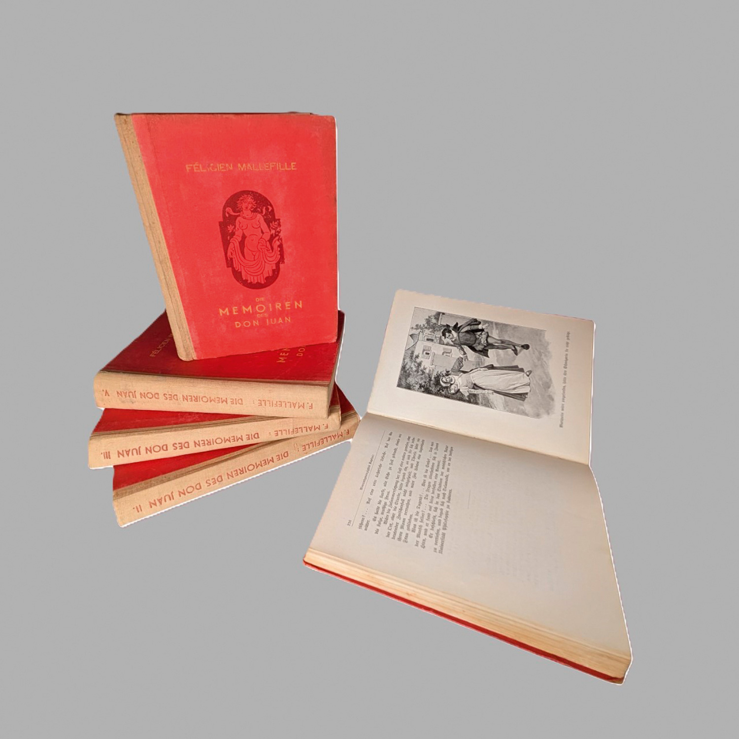 Mallefille, Felicien. Die Memoiren des Don Juan. Deutsche vollständige Ausgabe. Neu bearbeitet von G. von Jonelli. 5 Bände. Mit zahlreichen Illustrationen auf Tafeln von Coeurdame. 21,5 x 15 cm. Illustrierte OHalbleinenbände (etwas fleckig und berieben, Gelenke etwas gelockert). Leipzig, Prag und Wien, Alois Hynek (1914-1915).