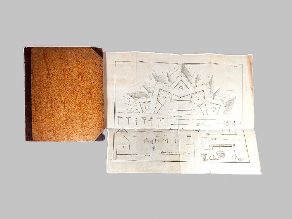 Etienne, Jean d'. Abhandlung von der Minirkunst zum Gebrauch junger Officiere, und derjenigen, die eine genaue Kenntniß von dieser Kunst zu erlangen wünschen. Aus dem Französischen übersetzt und mit vielen nöthigen Anmerkungen versehen von E. M. S. A. (d. i. Wilhelm Friedrich Karl von Schwerin. 9 Bl., 258 S. Mit 7 mehrfach gefalteten Kupfertafeln. 23,5 x 20 cm. Halbleder d. Z. (etwas fleckig und berieben) mit dezenter RVergoldung und 2 farbigen goldgeprägten RSchildern. Münster und Hamm, Philipp Heinrich Perrenon, 1779.