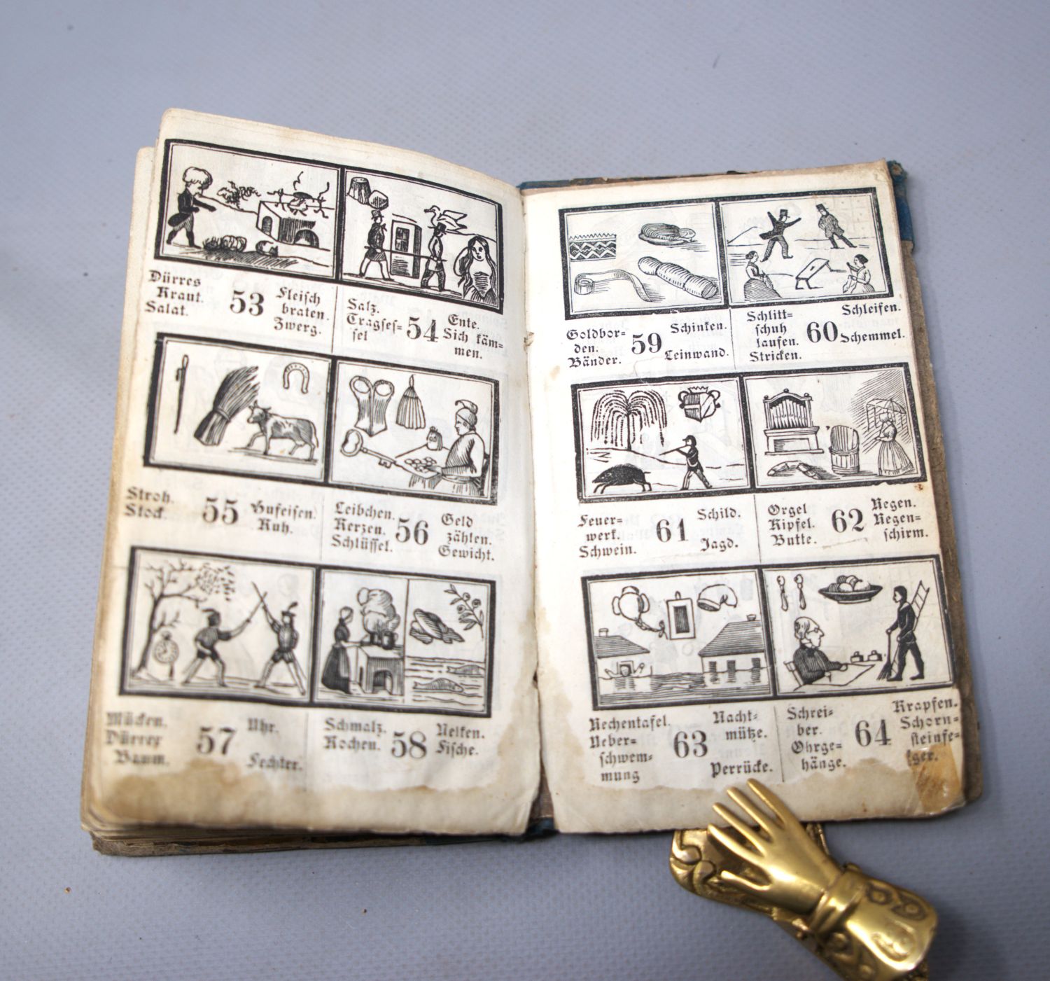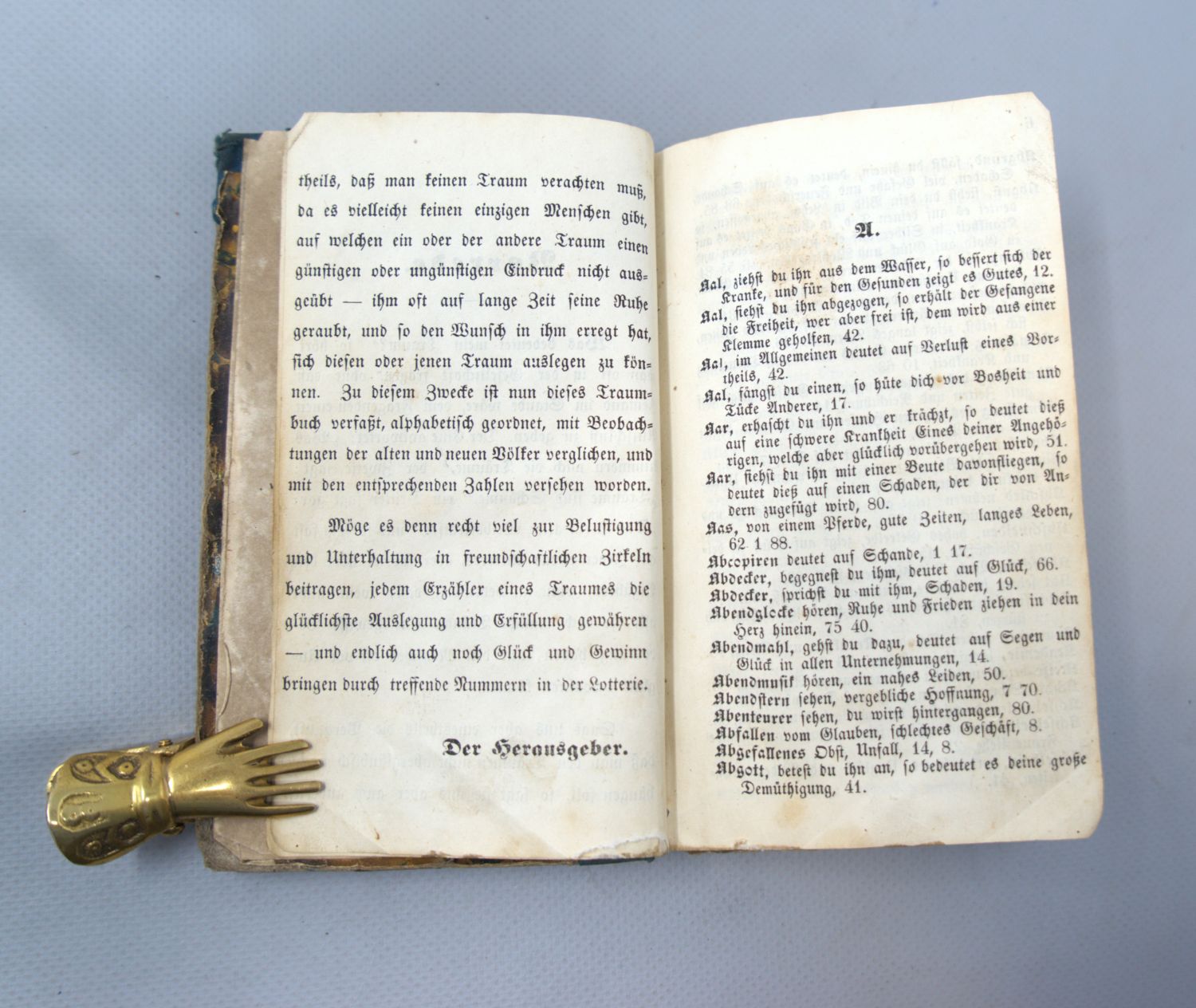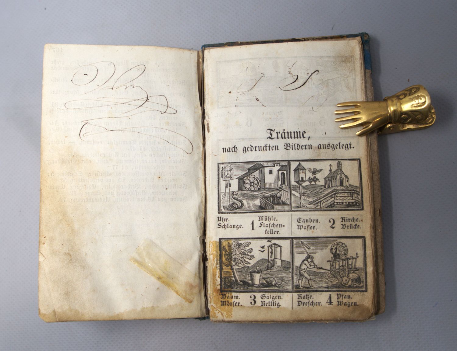 Neuestes Traum-Buch oder Anweisung Träume auszulegen. Zur Unterhaltung und Belustigung in Mußestunden. 167 S. Mit 90 kleinen Holzschnitten aus 8 Blättern. 16 x 9 cm. Halbleinen d. Z. (stark lädiert, mit mehreren Fehlstellen und Flecken). Brünn, C. Winiker, 1856.