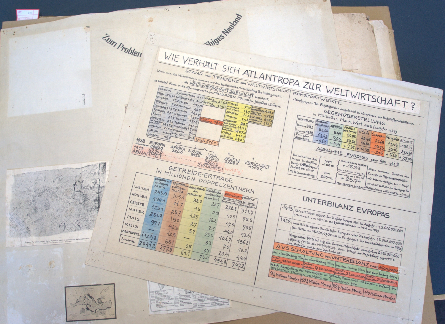 3) "Gegenüberstellung von 3 Wunschbildern, d. Welt zu organisieren." 76 x 46 cm. - Gegenüberstellung der Pläne "I. Coudenhove: Paneuropa", "II. Woytinsky: Vereinigt. Staaten Europas", "III. Sörgel: Atlantropa". Und unten das Resümé: "Warum braucht Amerika keine Kolonien? Weil es Länder in allen Zonen hat. - Ebenso Atlantropa."