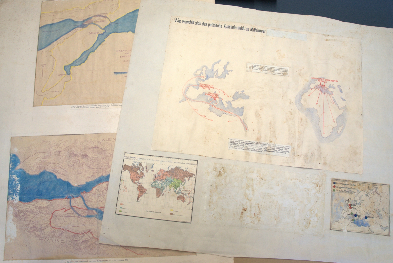 6) "Wie wandelt sich das politische Kraftlinienfeld am Mittelmeer". Karton mit 3 (von 5) Kollagen. 66 x 75 cm.