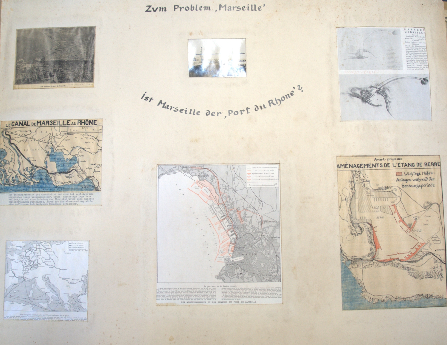 5) "Zum Problem 'Marseille' - ist Marseille der 'Port du Rhone'?" 65 x 83 cm. Passepartoutkarton mit 7 Kollagen, darunter eine Silbergelatine-Fotografie des Hafens.