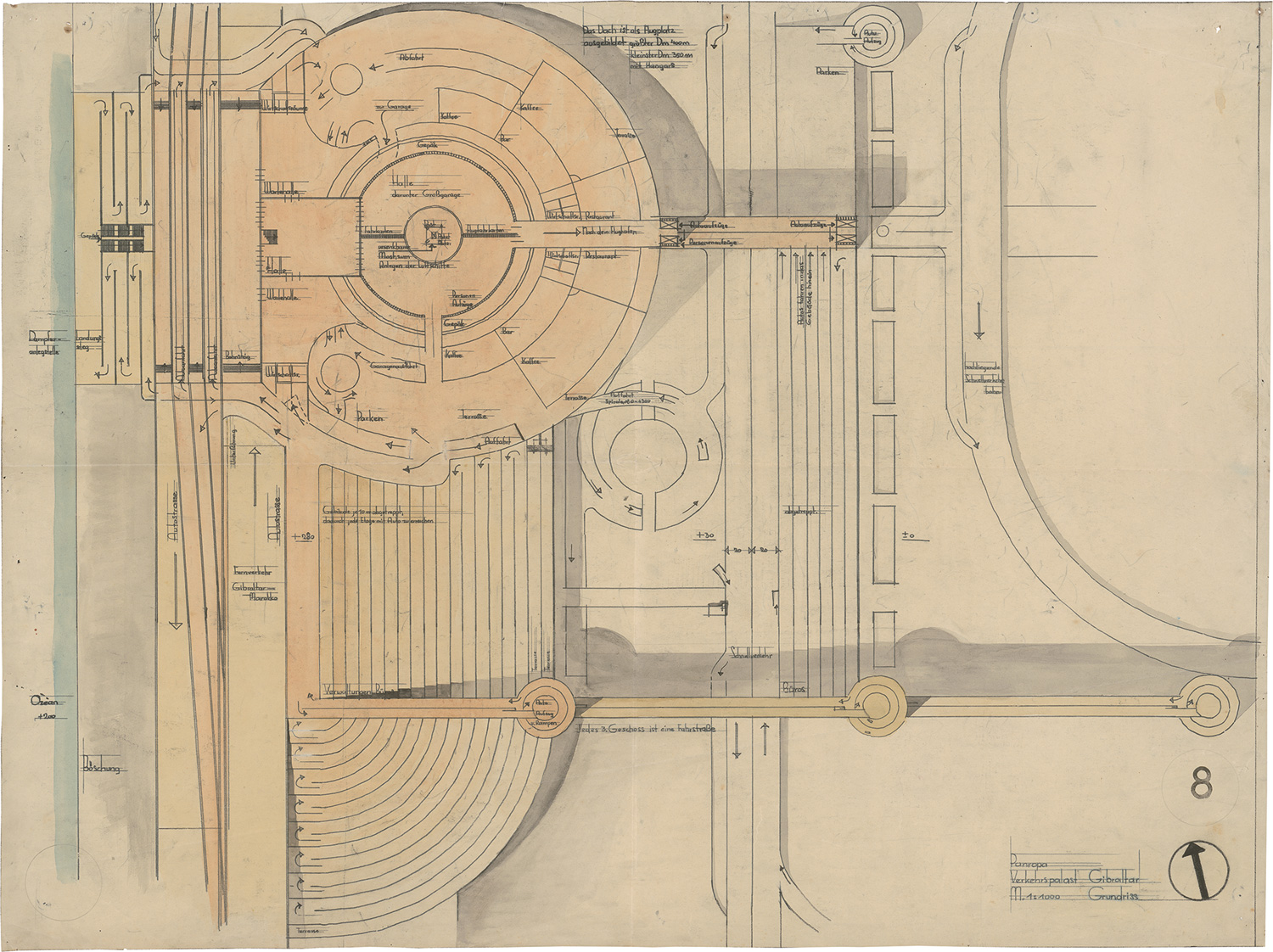 Die Dimensionen des monumentalen "Verkehrspalastes in der Bäderstadt", eines Knotenverteilers der unterschiedlichen Verkehrsmittel, die das Wiener Büro von Peter Behrens für das Atlantropa-Projekt des Herman Sörgel in Gibraltar plante, werden vor allem aus dem "Grundriss" ersichtlich: so sollte das bebaute Gelände nicht weniger als ca. 560.000 m² umfassen (800m vom Meer ins Land und 700m in der Breite). Allein die zentrale Rotunde mit einem Durchmesser von 350m hätte mit bis zu 17 Stockwerken eine Fläche von über 1 1/2 Millionen Quadratmetern (>1.632.000 m²) für "Fahrspuren, Garagenzufahrten, Parkplätze, Terrassen, Entré- und Wandelhalle, Personen- und Autoaufzüge, Verwaltungs- und Wirtschaftsräume, aber auch Lagerhallen, Gepäckaufbewahrungen, ein Café und eine Bar" etc. geboten. Im Westen anschließend war ein riesiger Bahnhof geplant mit "Autostrasse - Fernverkehr Gibraltar-Marokko", mehreren Eisenbahngeleisen, einer "Dampferanlegestelle" mit "Landungssteg" am Atlantischen Ozean - und auf dem Dach der Rotunde ist ein ganzer Flugplatz sowie eine Zeppelin-Haltestelle vorgesehen, wie es ebenfalls in den Textbezeichnungen heißt: "Das Dach ist als Flugplatz ausgebildet größter D[urch]M[esser] 400 m, kleinster DM 350 m mit Hangar". Im Kreismittelpunkt der Rotunde befindet sich auf dem Plan ein "versenkbarer Mast zum Anlegen der Luftschiffe".