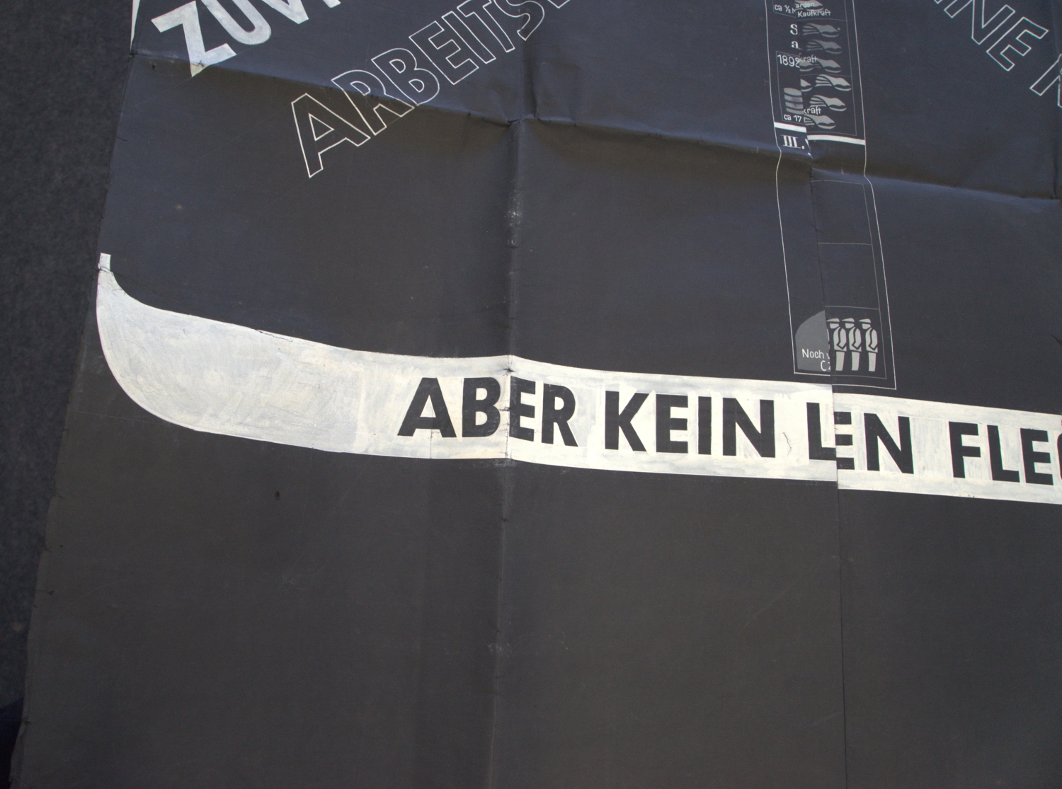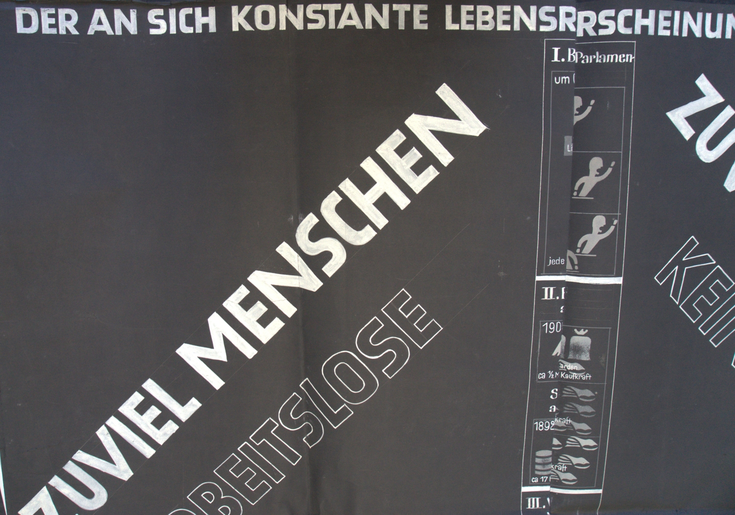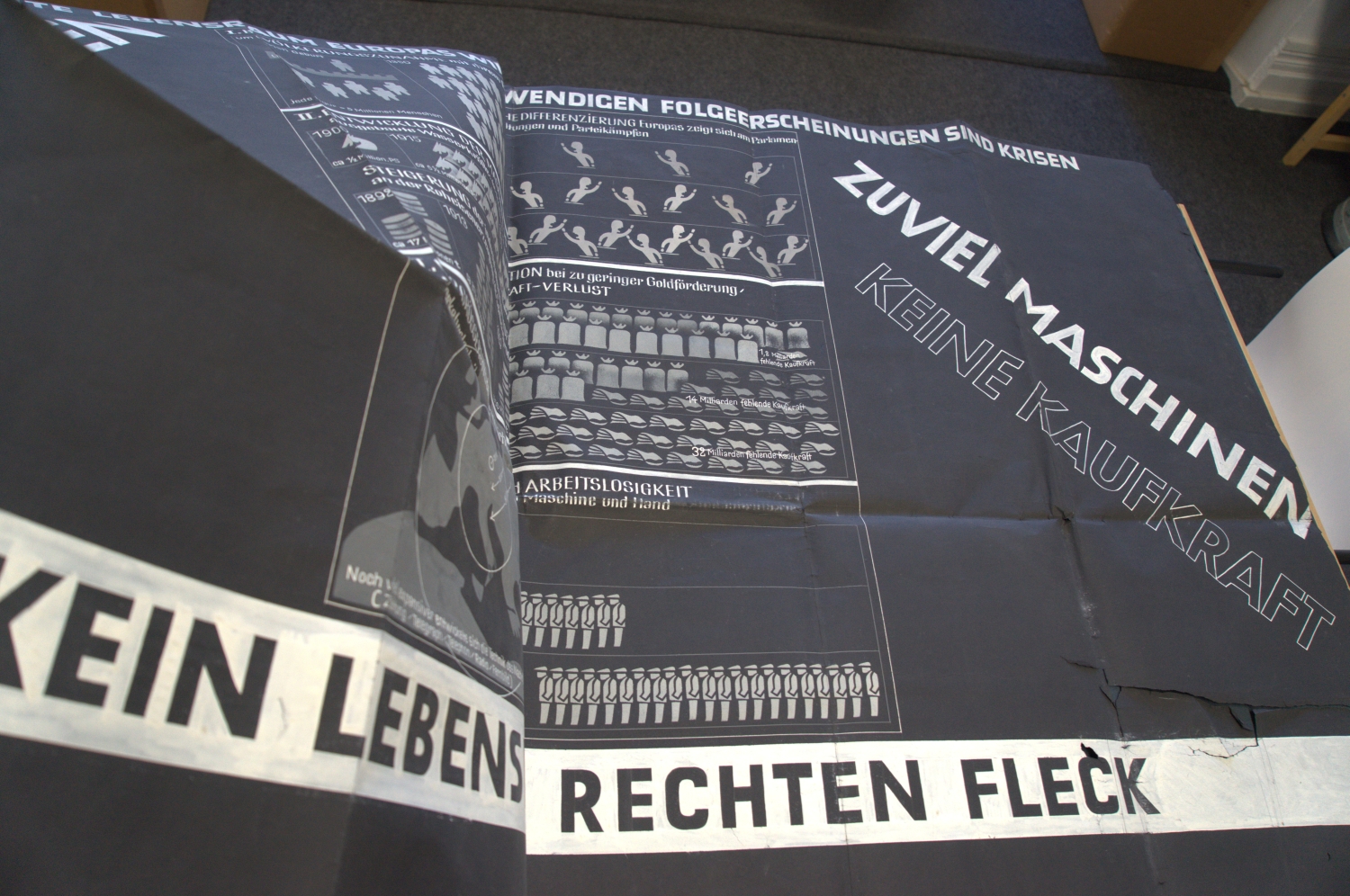 Plakative Darstellung der Menschheitsprobleme am Anfang der dreißiger Jahre aus eurozentristischer Perspektive, entstanden für die Wiener Ausstellung zu Herman Sörgels "Panropa-", dem späteren sogenannten "Atlantropa-Projekt". Das Großplakat benennt die Hauptprobleme: "Zuviel Menschen Arbeitslose - Durch den Weltkrieg wurden auf allen Gebieten ungeheuere Werte vernichtet - Zuviel Maschinen, keine Kaufkraft. Aber kein Lebensraum am rechten Fleck". Einzelne Graphiken widmen sich je einem Detailproblem: "I. Bevölkerungszunahme mit ihrem Expansionsdrang", "II. Entwicklung der Maschine in PS", "Steigerung der industriellen Rohstoffgewinnung", "III. Vergrösserung des menschlichen Aktionsradius durch die Verkehrstechnik", "Ia. Die politische Differenzierung Europas", "IIa. Überproduktion bei zu geringer Goldförderung, daraus Kaufkraft-Verlust", "IIIa. Erwerb- und Arbeitslosigkeit - Konflikt zwischen Maschine und Hand". – Rechter Rand unten mit größerem, sonst nur kleinere Einrisse (ohne Bildverlust), verso mehrere alte Klebe- und Montagespuren, mehrfach gefaltet, sonst nur mäßige Gebrauchsspuren.