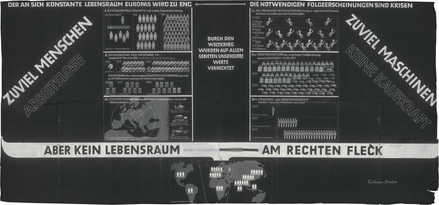 Eichheim, Max, und René Binder. Panropaprojekt. "Der an sich konstante Lebensraum Europas wird zu eng - die notwendigen Folgeerscheinungen sind Krisen". Monumentale Schautafel. Weiße und grauschwarze Tusche über Bleistift auf schwarzem Tonkartonpapier. 138 x 300 cm. Wien um 1932.