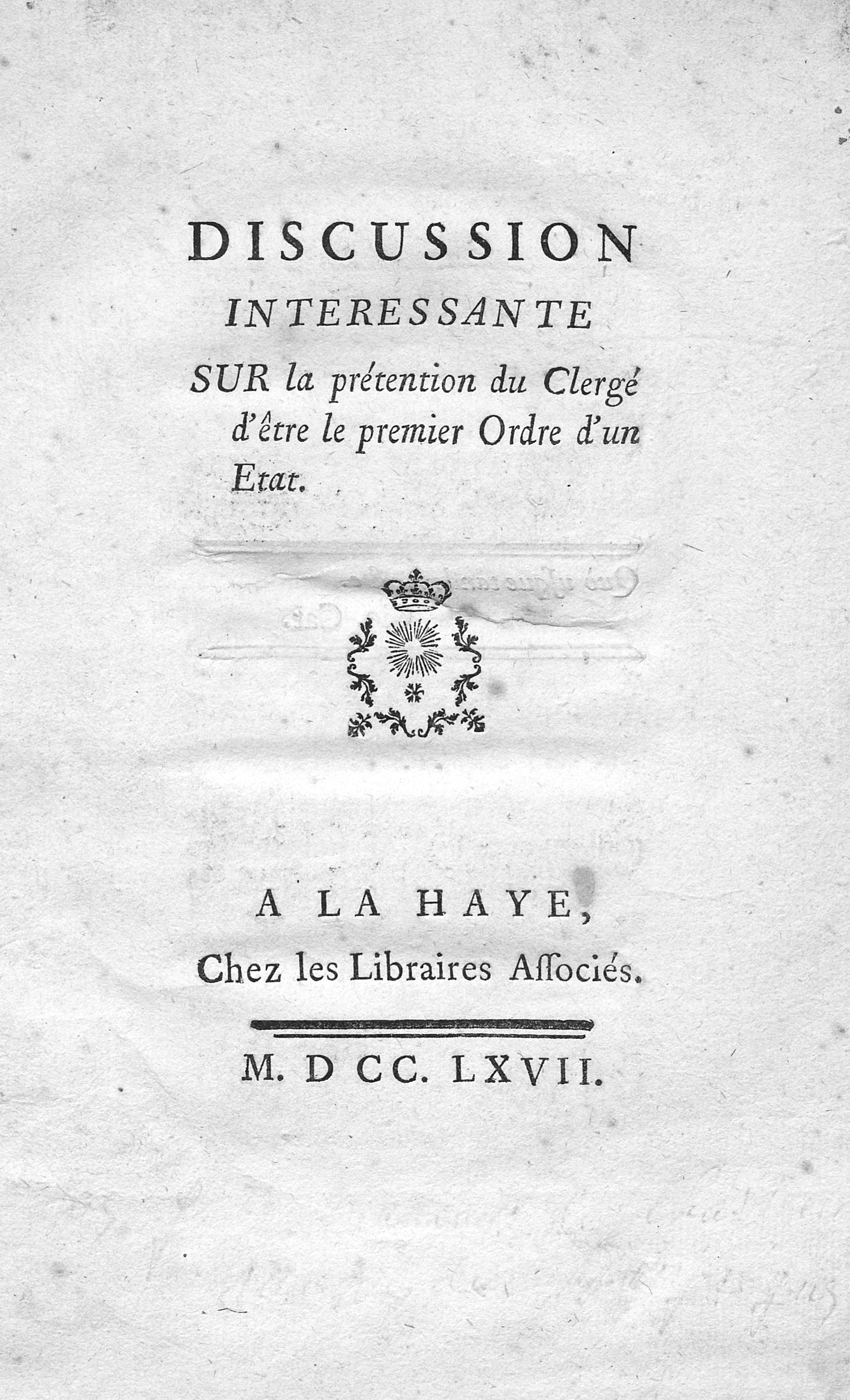(Puységur, J.-F.-M. de Chastenet de). Discussion intéressante sur la prétention du clergé d'être le premier ordre d'un etat. 164 S. 24,5 x 22,5 cm. Leder im Stil d. Z. mit goldgeprägtem RTitel. Den Haag, Libraires Associés, 1767.