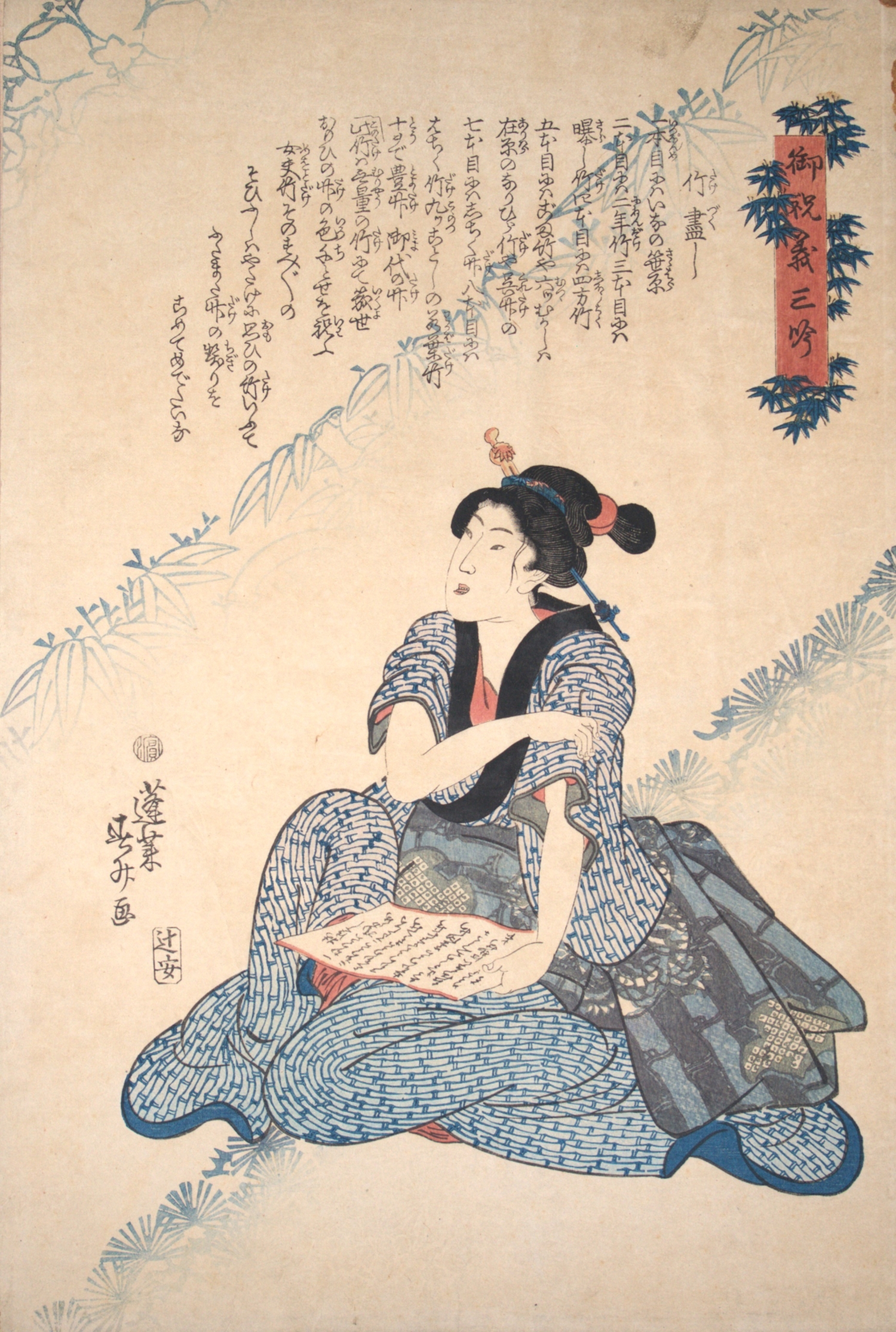 II. Katsukawa Shunshô. Sitzende Japanerin über Handschrift. - Auf festem Velin montiert. - Auf Karton montiert.
