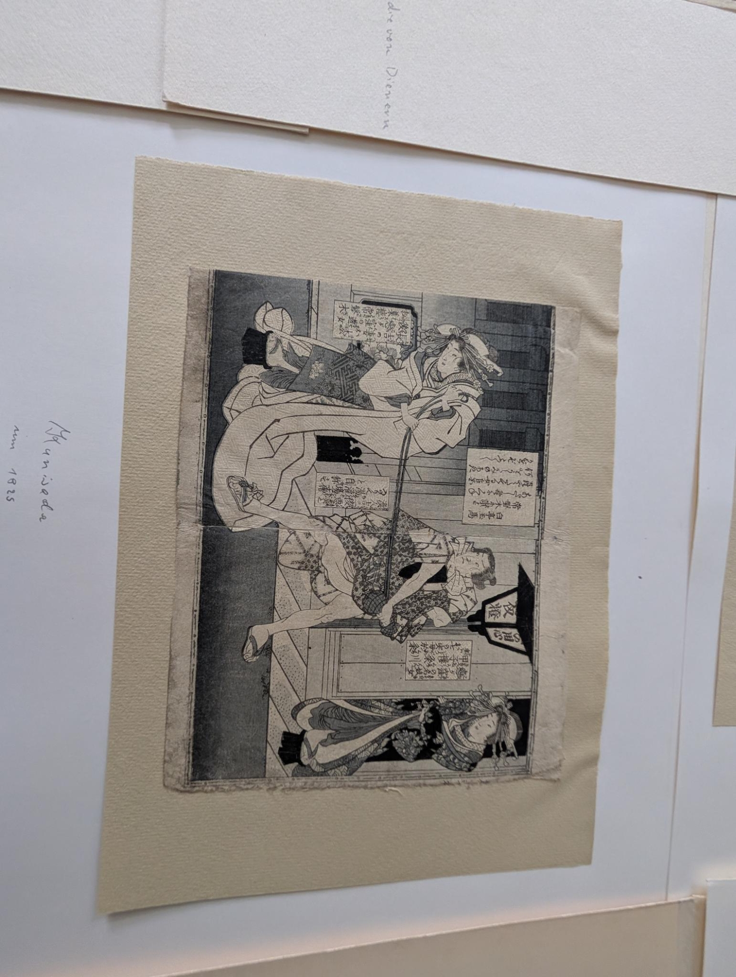 Japanische Buchholzschnitte. Sammlung von 9 Holzschnitt-Albumblättern, davon 3 koloriert, mit unterschiedlichen Darstellungen und von verschiedenen Künstlern, darunter Ando Ichiryusai Hiroshige und Totoya Hokkei. Aus Werken um 1720-1730 (3 Blätter) und um 1830-1850 (6 Blätter). Verschiedene Formate, überwiegend kakuban. Ca. 19 x 15 cm. Sämtlich unter Passepartout. Japan 1720-1850.