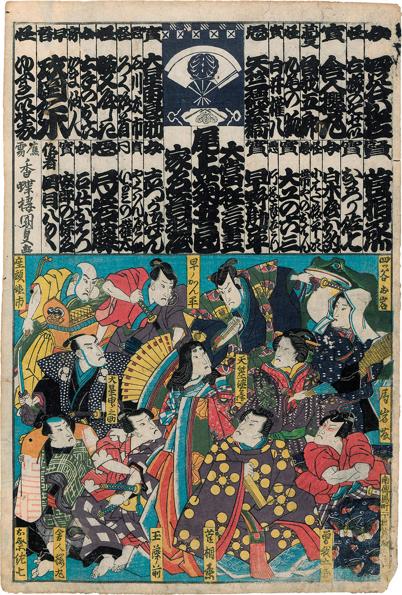 Umfangreiche Gruppe figürlicher japanischer Farbholzschnitte mit breitem ikonographischem Spektrum zwischen Theaterdarstellungen, Kriegerbildern, Historienepisoden, Bijin-Darstellungen und mythologischen Szenen. Vertreten sind unter anderem Drucke von Utagawa Kunisada, Utagawa Kuniyoshi, Toyohara Kunichika und weiteren Meistern der Utagawa-Schule. Dargestellt sind Schauspieler, legendäre Gestalten und Gottheiten in Porträts sowie Gruppen- und Genreszenen, darunter auch dramatische Kampf- und Schlachtendarstellungen. – Unterschiedlich erhalten, teils mit Montierungsspuren, Randläsuren, kleinen Fehlstellen, Flecken oder Bereibungen; einige Blätter aufgezogen. Insgesamt dekoratives Sammlungskonvolut.