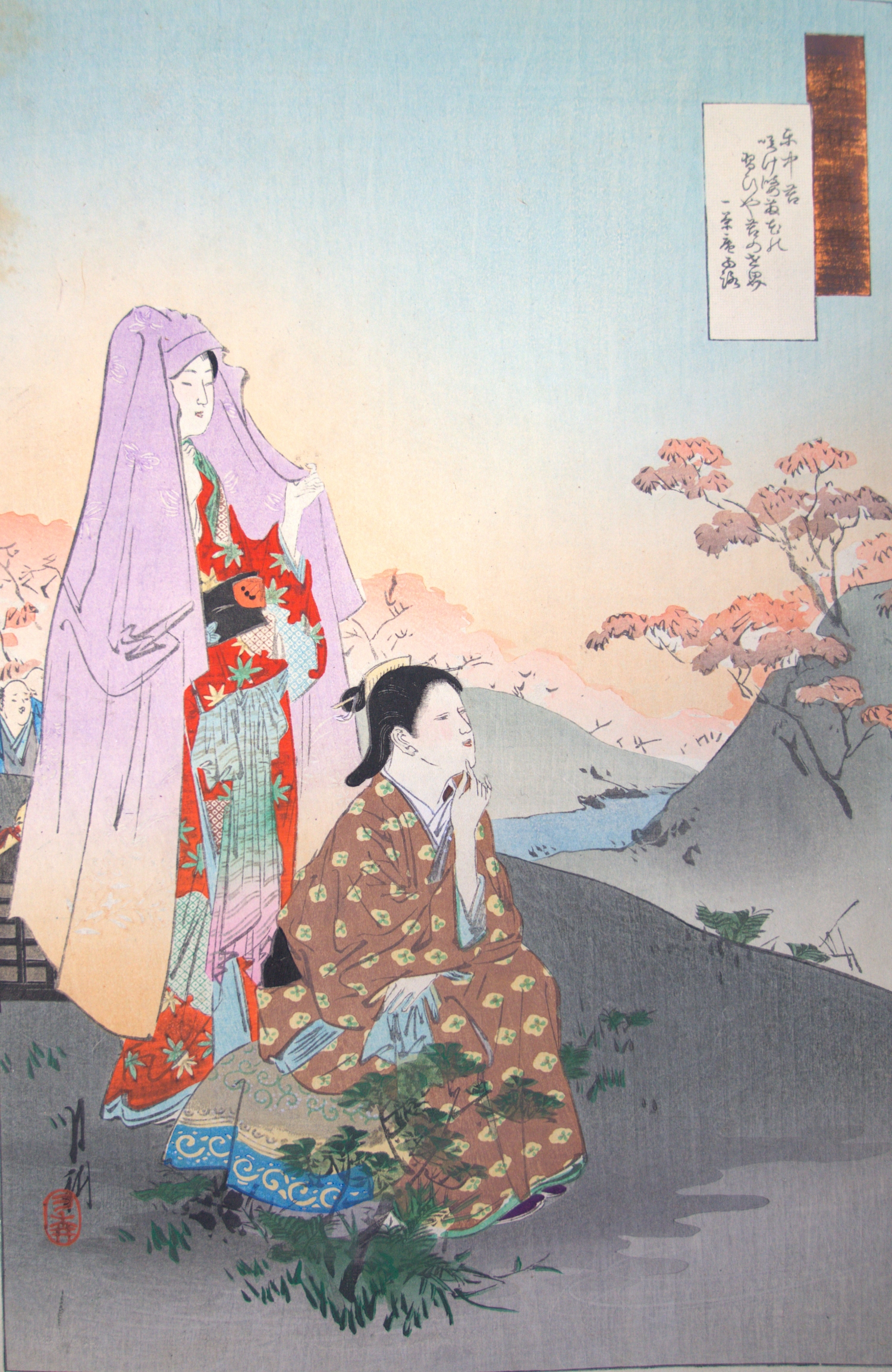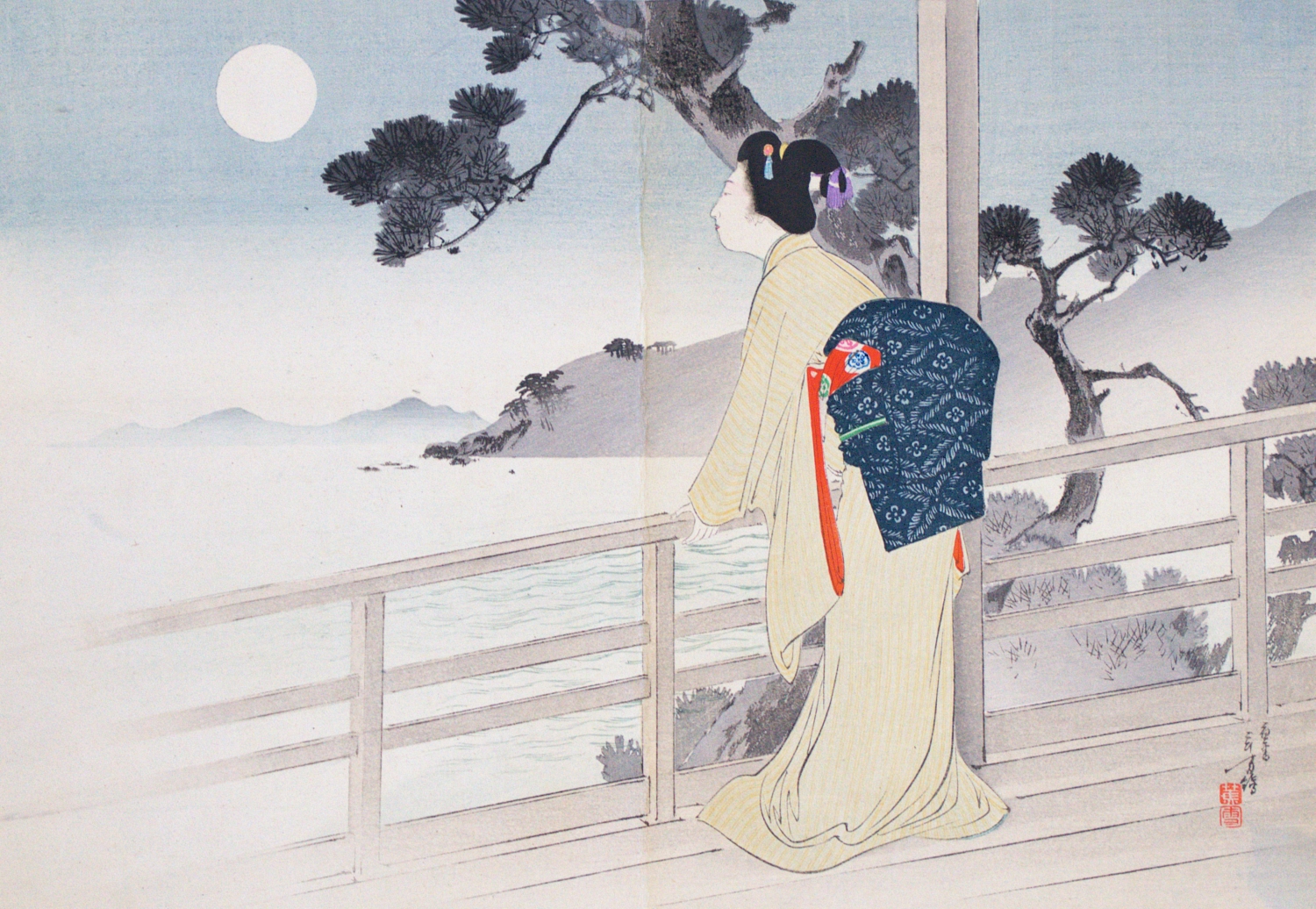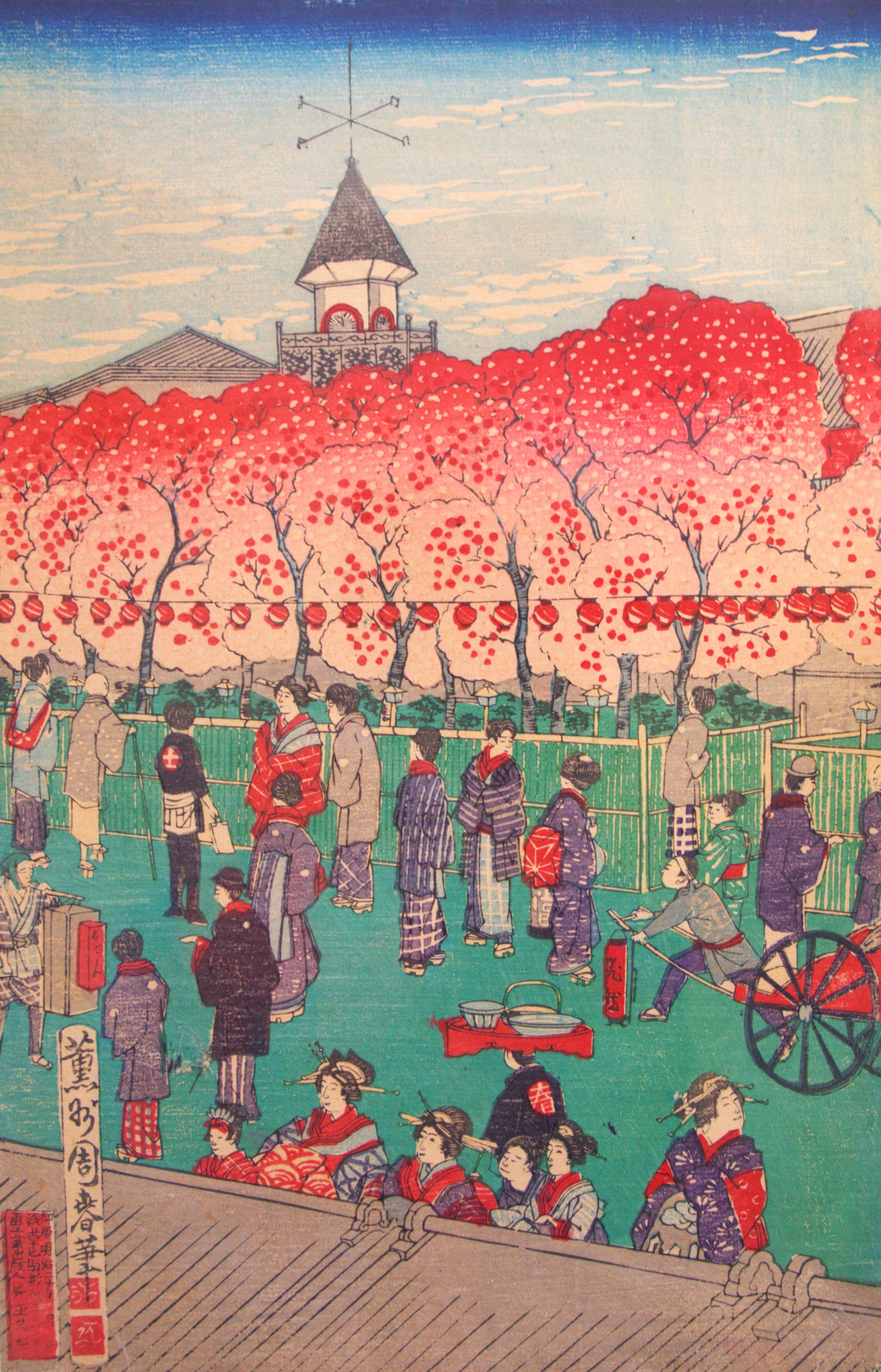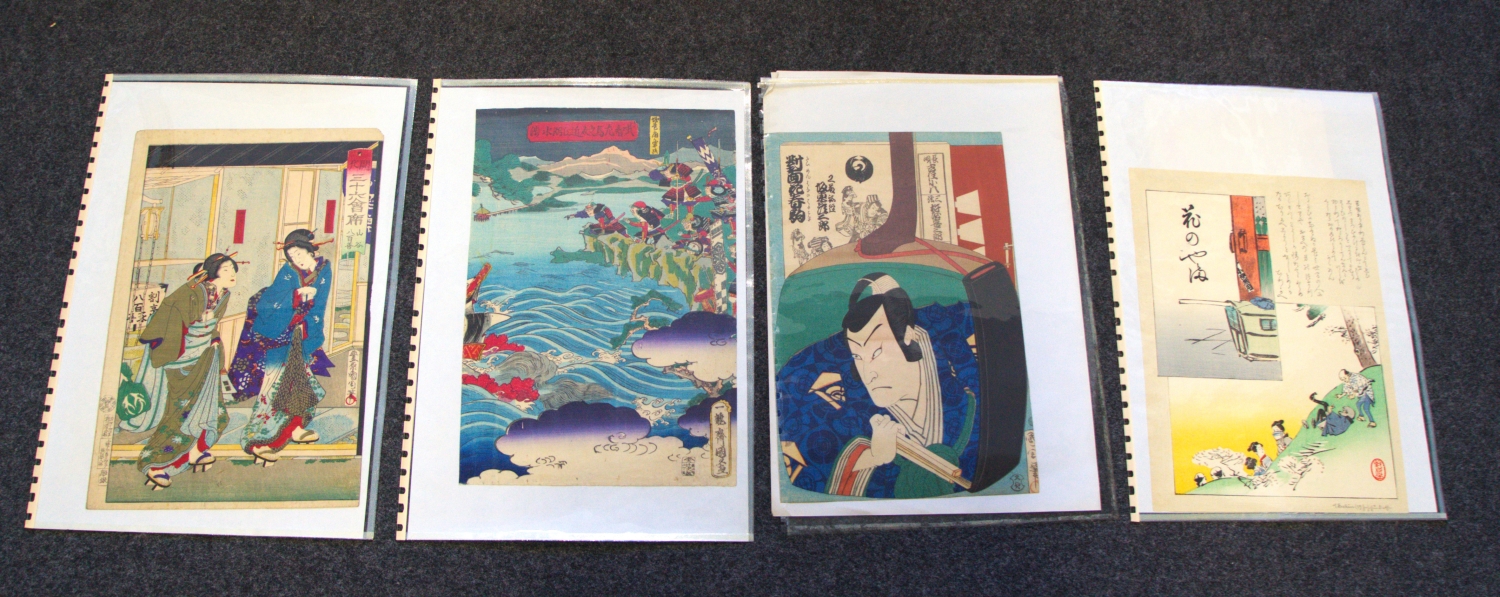 Vorhanden sind: I. Miyagi Gengyo. Titelblatt von "Einhundert Ansichten berühmter Orte in Edo". 1858. - II. Tokio Meisho. Die fünfzigjährige Geschichte der Kaiserlichen Universität. Um 1880. - III. Kabuki Masks. 20. Jahrhundert. - IV. Kirschblüten. Straßenszene. Um 1900. - V. Kunichika. Yaozen Restaurant in San'ya, von Kaika sanjuroku kaiseki. 1878. - VI. Kobayashi Kiyochika. Der verzweifelte Kampf von Hauptmann Asakawa in Tuchengzi. Triptychon. 1 (von 3) Ukiyo-e Farbholzschnitten. 1895. - VII. Mizuno Toshikata. Imasama Bijin. 1899. - VIII. Ochiai Yoshiiku. Aus der Serie Porträts als wahre Ebenbilder im Mondlicht (japonice: Makoto no tsukihana no sugata-e). 1867. - IX. Ogata Gekkô. Frauen bewundern Ahornbäume oder Azuma Nakanokimi aus der Serie "Gekkôs Sammelwerke" (japonice: Gekkô zuihitsu). 1892. - X. Derselbe. Staatsmann Takenouchi Sukune aus der Serie "Gekkôs Sammelwerke" (japonice: Gekkô zuihitsu). 1887. - XI. Derselbe. Zwei Frauen im Pferdestall aus der Serie "Gekkôs Sammelwerke" (japonice: Gekkô zuihitsu). Um 1890. - XII. Toyohara Kunichika. Schauspieler Bandô Hikosaburô. 1868.