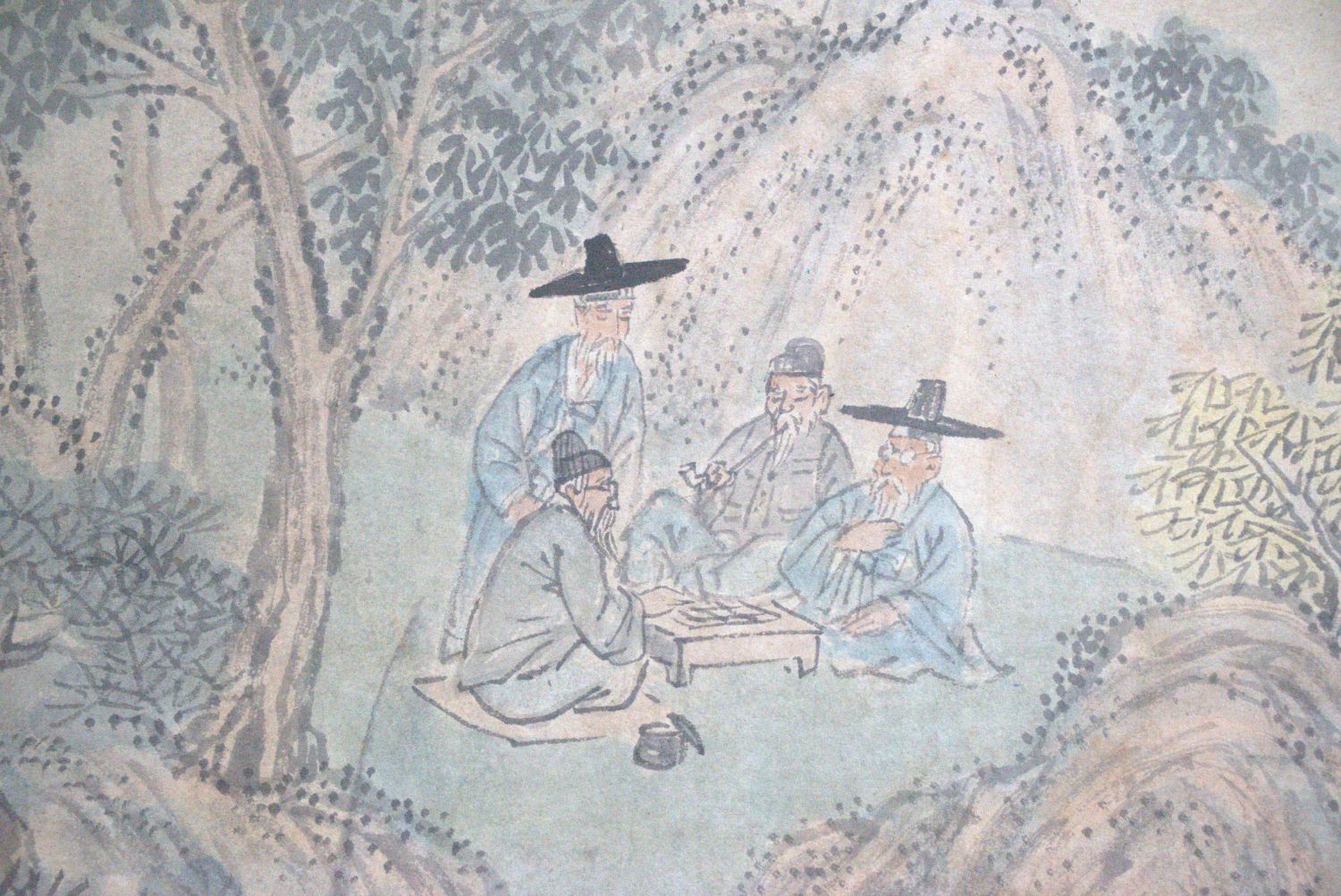Weiqi-Spieler. Chinesisches Tuschemalerei in Aquarellfarben auf Papier. 126 x 65 cm. Mit Goldbordüre aufgezogen auf festen Pappgrund und Spanholzplatte mit Leinenbezog recto, gerahmt in teilprofilierter Holzleiste 150 x 90 cm. China Ende 19. Jahrhundert.