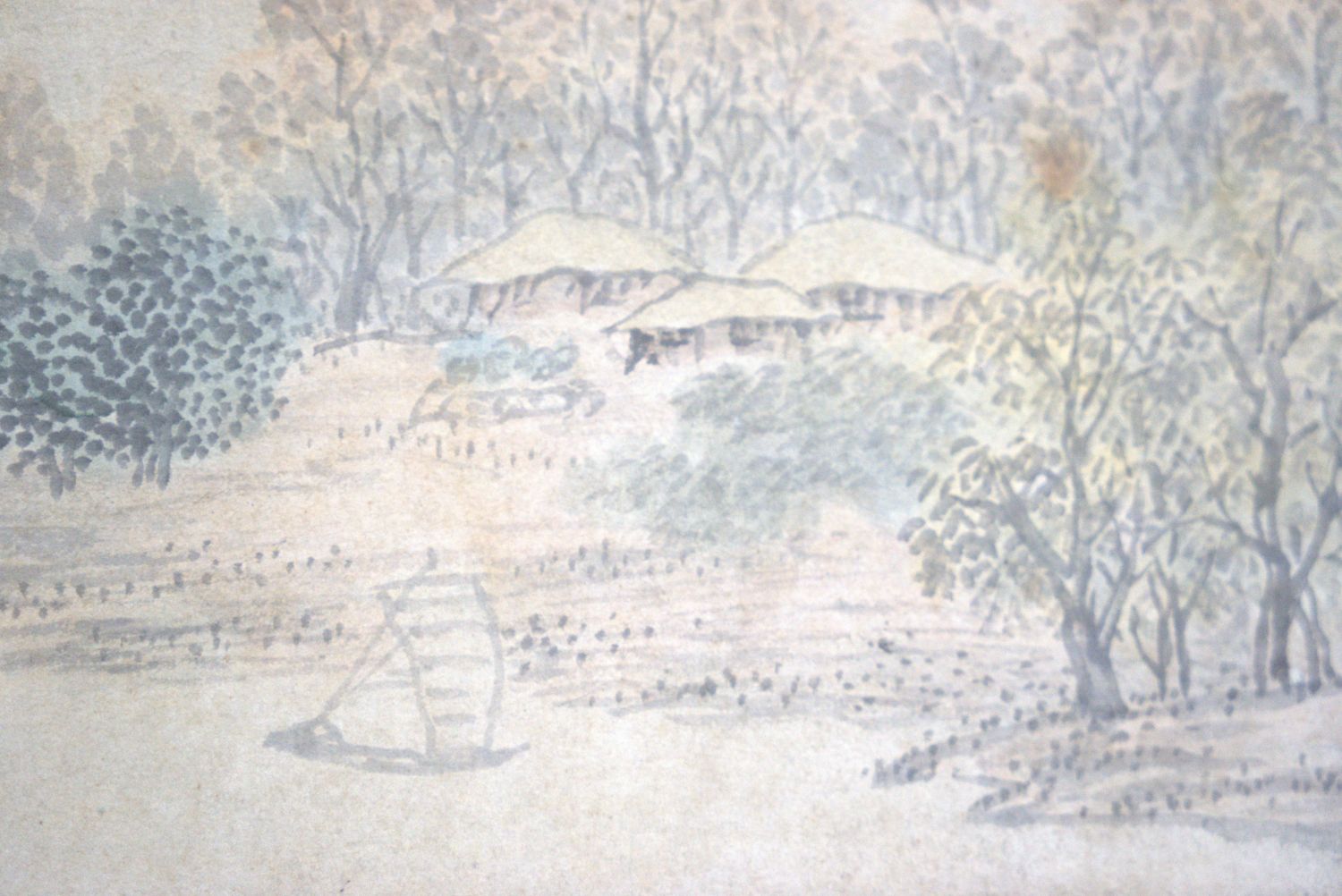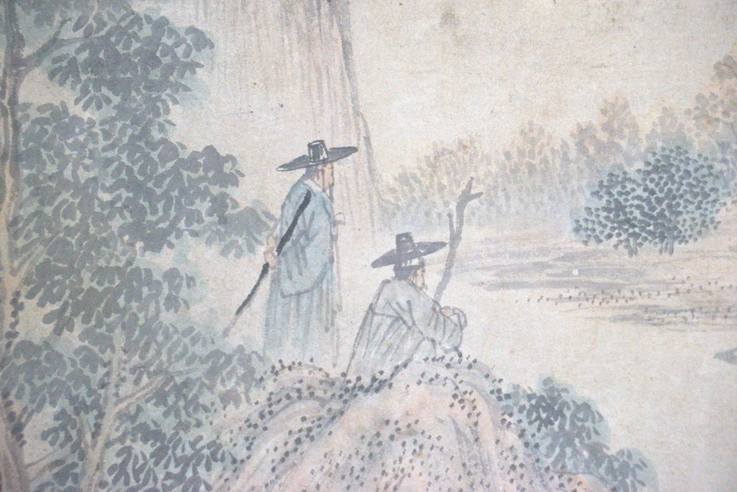In der chinesischen Tuschmalerei "Shuimo Hua" ist das am höchsten geschätzte Sujet die Landschaft, meist bizarre Bergwelten mit mächtigen Bäumen, mit Wasserfällen, Seen und Flüssen, die enge Schluchten durchschneiden. Figürliche Zusätze bilden meistens nur Staffagen, auch wenn sie oft titelgebend sind. Alles genannten Elemente finden sich hier: Die dargestellte Berglandschaft wirkt auch daher so gewaltig, weil die Staffagen, ein winziges Segelboot, kleine Häuser am Ufer, aber auch die Weiqi-Spieler im Bildmittelgrund eine Relation herstellen. Unten erscheinen zwei Landarbeiter, wohl damit beschäftigt, Reis zu dreschen, während auf einer Bergwiese zwei Spieler das berühmte Weiqi- bzw. Go-Brettspiel spielen, während zwei Zuschauer, einer mit langer Pfeife, ihnen Gesellschaft leisten. – Mehrere, jedoch meist nur kleinere Flecke, hier und da Oberflächenbereibungen, allenthalber kleine Randläsuren, fest auf Kartonpappe montiert, sehr dekorativ und kontemplativ. - Schön gerahmt, nicht ausgerahmt, Versand jedoch nur ohne Rahmen.