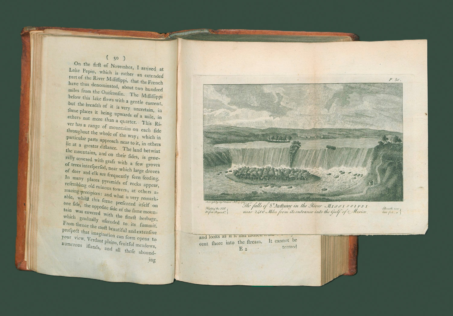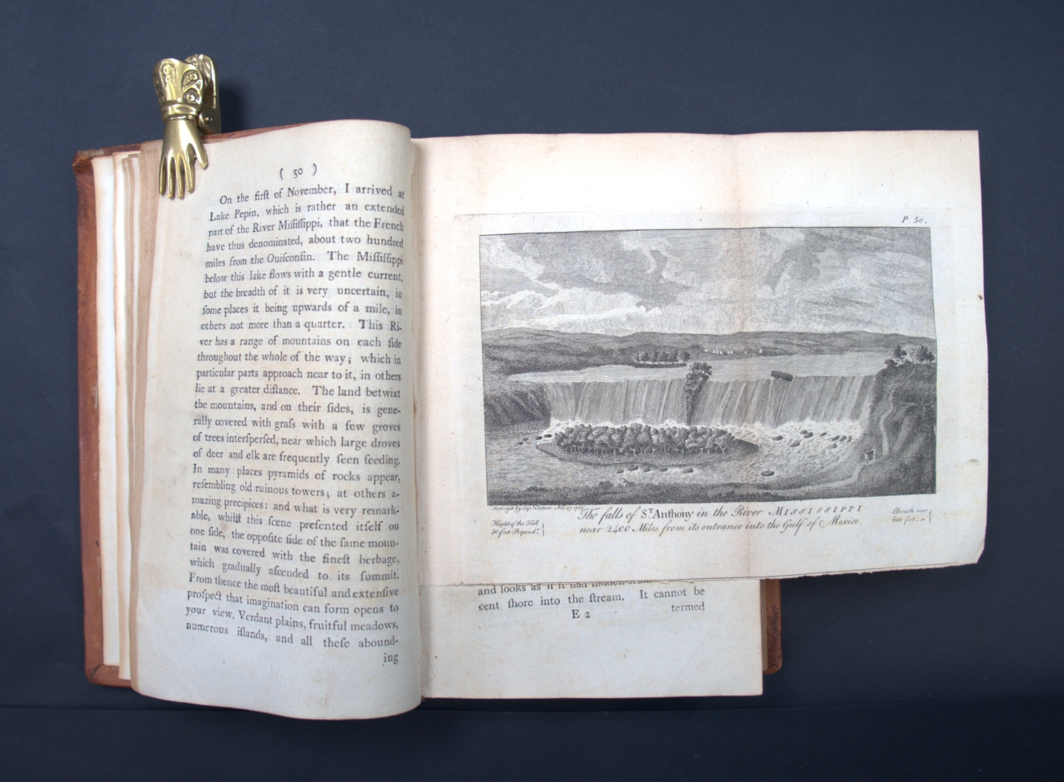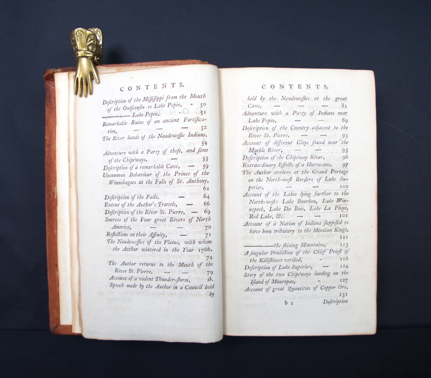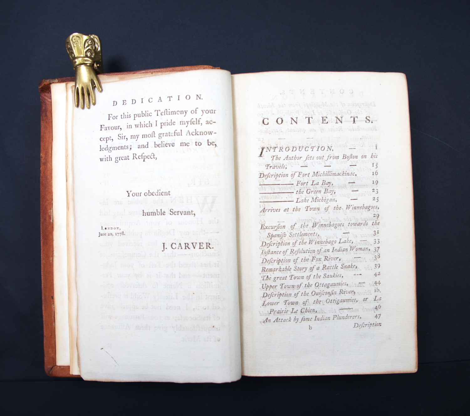 Carver, Jonathan. Travels through the interior parts of North America, in the years 1766, 1767, and 1768. 11 Bl., XIII, 508 S., 1 Bl. Mit 2, teils gefalteten Kupfertafeln und gefaltete Kupferstichkarte. 21 x 12 cm. Leder des 19. Jhr. (etwas berieben, bestoßen und leicht lichtrandig) mit goldgeprägtem RSchild. Dublin, S. Price, R. Cross, W. Watson etc., 1779.