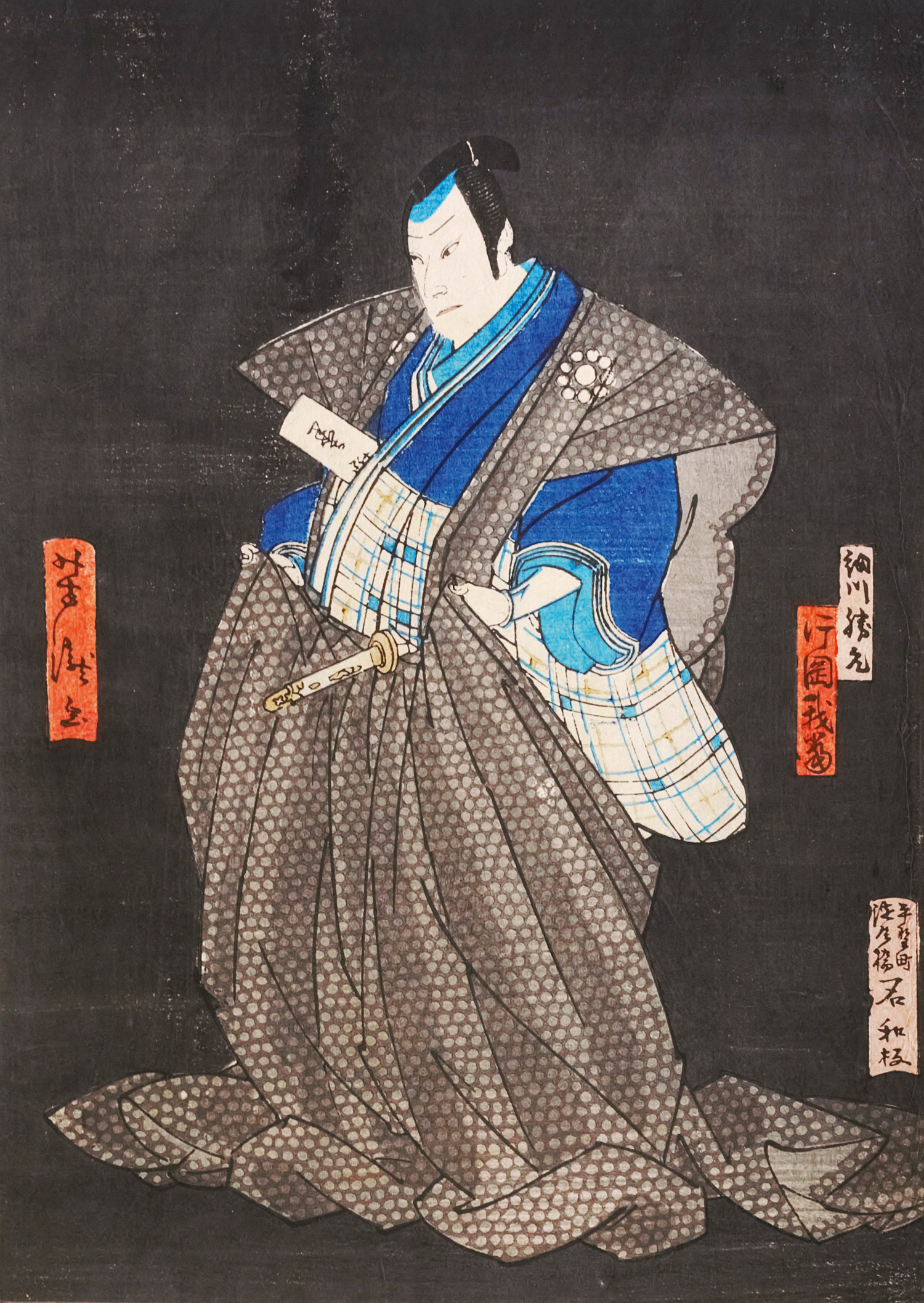 Der Holzschnitt zeigt einen Kabuki-Darsteller in Ganzfigur vor schwarzem Grund. Er ist in einen weiten, grau-gepunkteten Umhang gehüllt, darunter trägt er einen blauen Kimono. Aus den Falten seines Gewandes ragt der Griff seines Katana hervor. – Auf Japan aufgezogen. Überaus farbkräftig.