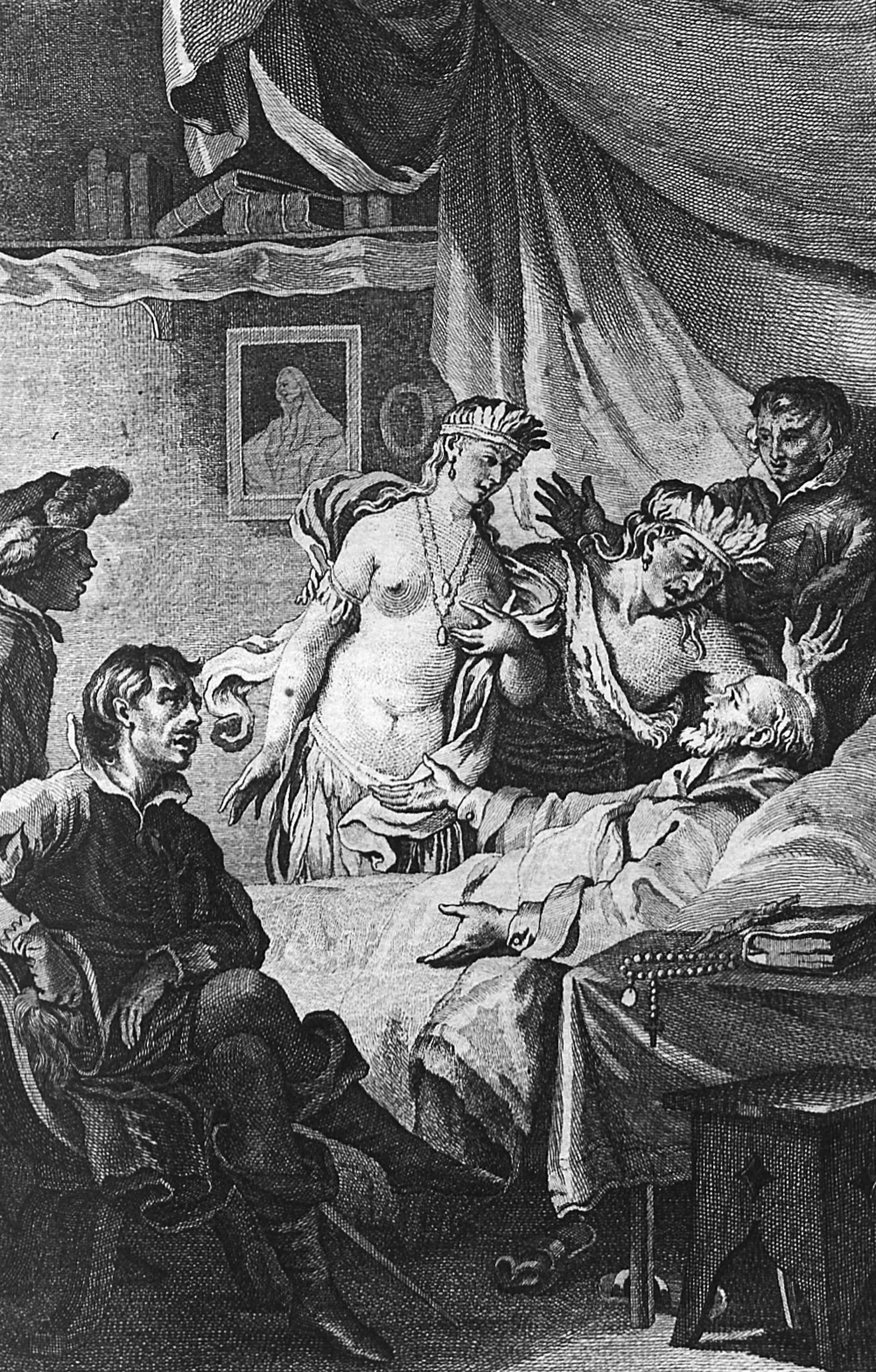 Marmontel, (Jean François). Les Incas, ou la destruction de l'empire du Pérou. 2 Teile in 1 Band. XXXVII, 254 S.; 2 Bl., 310 S. Mit 11 Kupfertafeln nach Moreau. 19,5 x 11,5 cm. Moderner marmorierter Halblederband. Bern und Lausanne, Société Typographique, 1777.